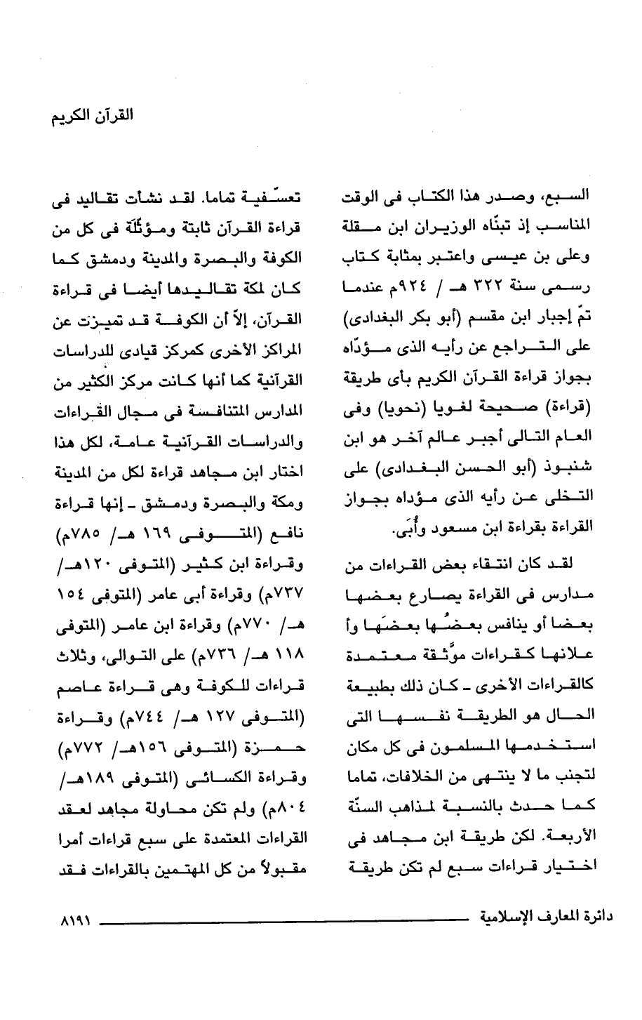 السبع، وصدر هذا الكتاب فى الوقت المناسب إذ تبنَّاه الوزيران ابن مقلة وعلىّ بن عيسى واعتبر بمثابة كتاب رسمى سنة 322 هـ/ 924 م عندما تمّ إجبار ابن مقسم (أبو بكر البغدادى) على التراجع عن رأيه الذى مؤدّاه بجواز قراءة القرآن الكريم بأى طريقة (قراءة) صحيحة لغويا (نحويا) وفى العام التالى أجبر عالم آخر هو ابن شنبوذ (أبو الحسن البغدادى) على التخلى عن رأيه الذى مؤداه بجواز القراءة بقراءة ابن مسعود وأُبَى.