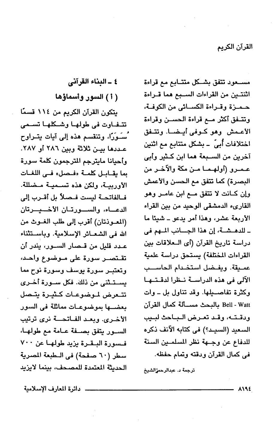 يتكون القرآن الكريم من 114 قسمًا تتفاوت فى طولها وشكلها تسمى سُوَرًا، وتنقسم هذه إلى آيات يتراوح عددها بين ثلاثة وبين 286 أو 287. وأحيانا ما يترجم المترجمون كلمة سورة بما يقابل كلمة "فصل" فى اللغات الأوربية، ولكن هذه تسمية مضللة. فالفاتحة ليست فصلًا بل أقرب إلى الدعاء، والسورتان الأخيرتان (المعوذتان) أقرب إلى طلب الغوث من اللَّه فى الشعائر الإسلامية. وباستثناء عدد قليل من قصار السور، يندر أن تقتصر سورة على موضوع واحد، وتعتبر سورة يوسف وسورة نوح مما يستثنى من ذلك. فكل سورة أخرى تتعرض لموضوعات كثيرة يتصل بعضها بموضوعات مماثلة فى السور الأخرى. وبعد الفاتحة نرى ترتيب السور يتفق بصفة عامة مع طولها، فسورة البقرة يزيد طولها عن 700 سطر (60 صفحة) فى الطبعة المصرية الحديثة المعتمدة للمصحف، بينما لا يزيد