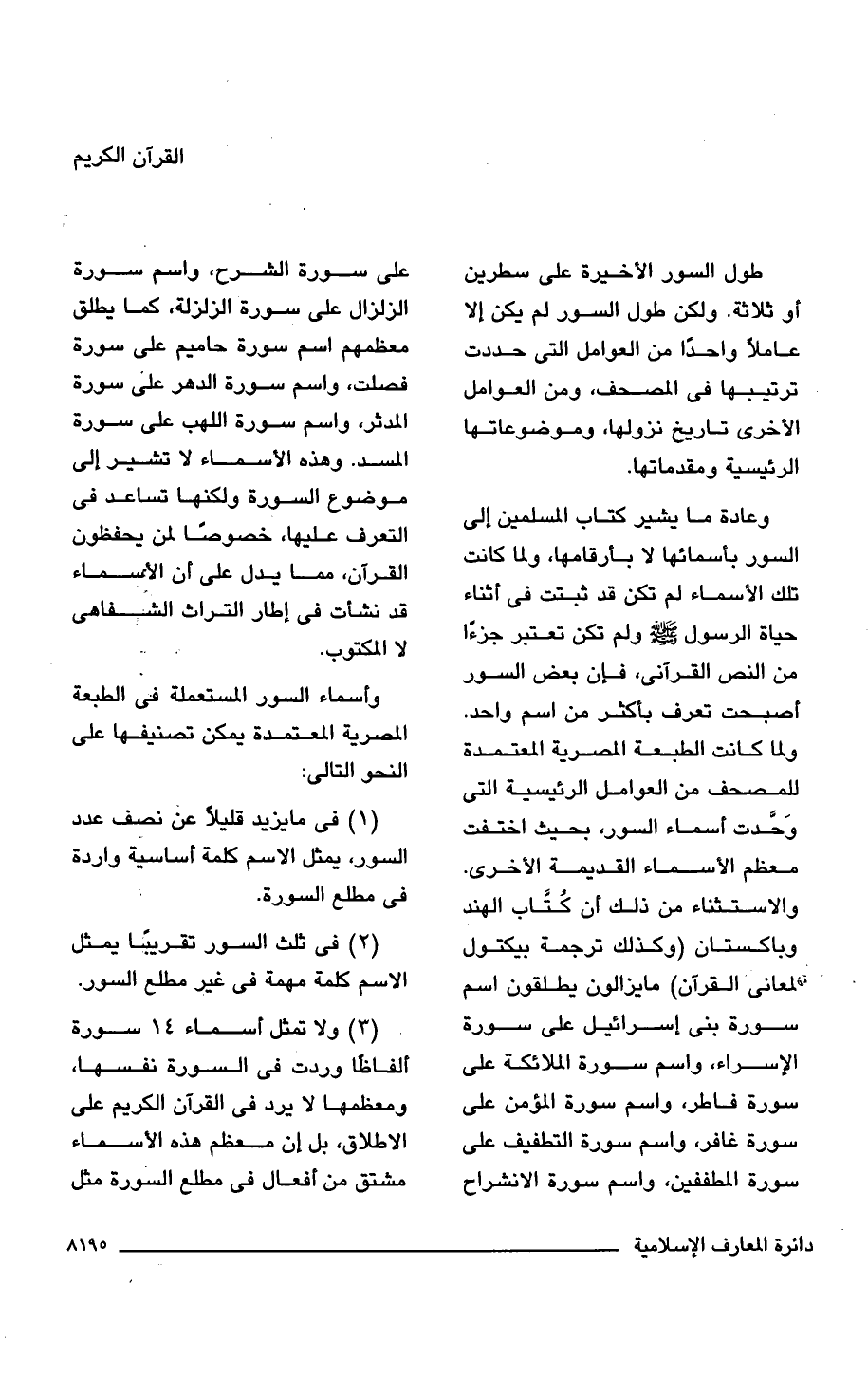 طول السور الأخيرة على سطرين أو ثلاثة. ولكن طول السور لم يكن إلا عاملًا واحدًا من العوامل التى حددت ترتيبها فى المصحف، ومن العوامل الأخرى تاريخ نزولها، وموضوعاتها الرئيسية ومقدماتها.