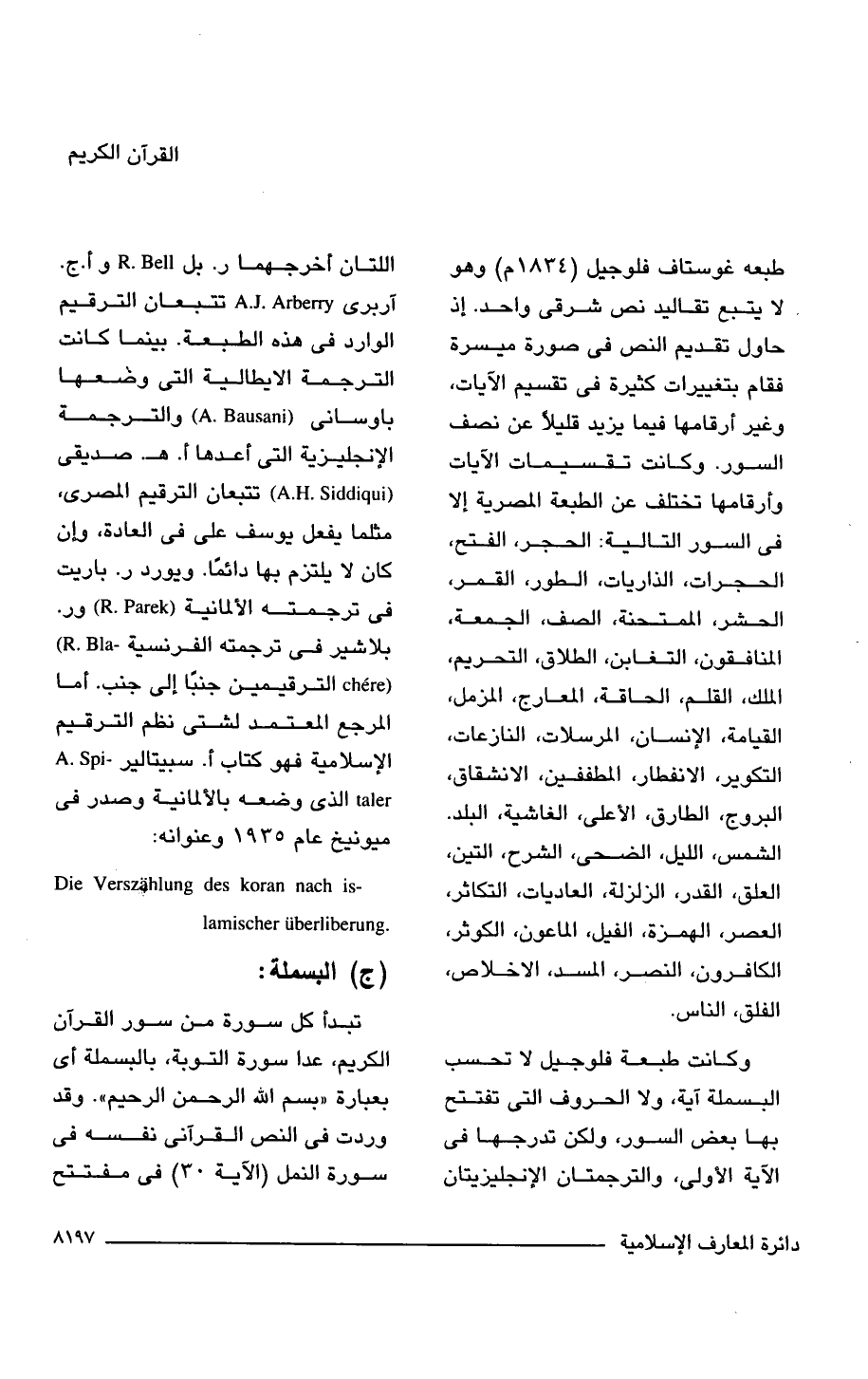وكانت طبعة فلوجيل لا تحسب البسملة آية، ولا الحروف التى تفتتح بها بعض السور، ولكن تدرجها فى الآية الأولى، والترجمتان الإنجليزيتان اللتان أخرجهما ر. بل R. Bell وأ. ج. آربرى A.J. Arberry تتبعان الترقيم الوارد فى هذه الطبعة. بينما كانت الترجمة الايطالية التى وضعها باوسانى (A. Bausani) والترجمة الإنجليزية التى أعدها أ. هـ. صديقى (A.H. Siddiqui) تتبعان الترقيم المصرى، مثلما يفعل يوسف على فى العادة، وإن كان لا يلتزم بها دائمًا. ويورد ر. باريت فى ترجمته الألمانية (R. Parek) ور. بلاشير فى ترجمته الفرنسية (R. Blachere) الترقيمين جنبًا إلى جنب. أما المرجع المعتمد لشتى نظم الترقيم الإسلامية فهو كتاب أ. سبيتالير A. Spitaler الذى وضعه بالألمانية وصدر فى ميونيخ عام 1935 وعنوانه: