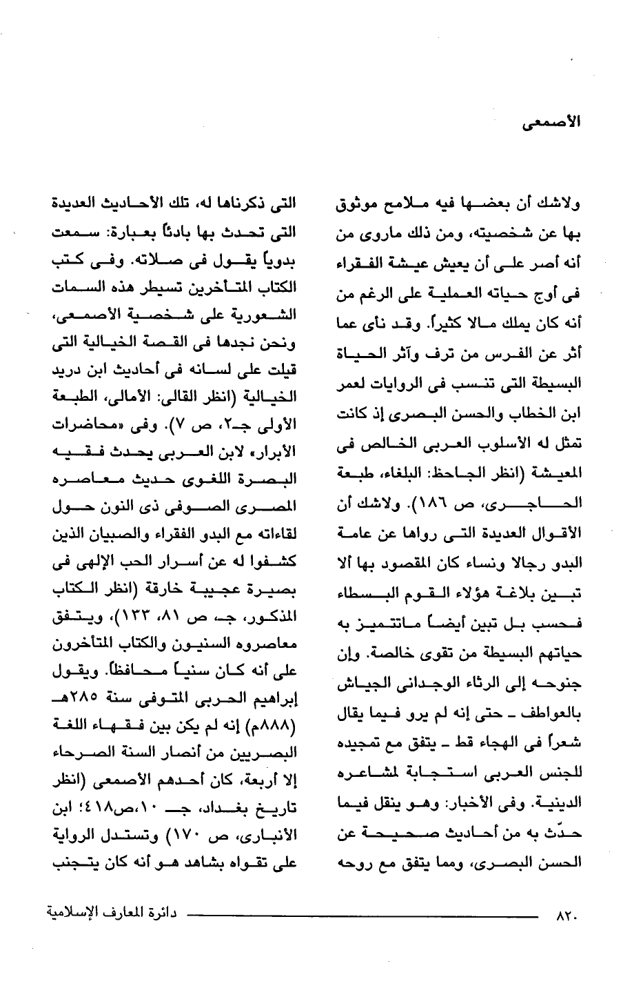 ولاشك أن بعضها فيه ملامح موثوق بها عن شخصيته، ومن ذلك ما روى من أنه أصر على أن يعيش عيشة الفقراء فى أوج حياته العملية على الرغم من أنه كان يملك مالا كثيرًا. وقد نأى عما أثر عن الفرس من ترف وآثر الحياة البسيطة التى تنسب فى الروايات لعمر ابن الخطاب والحسن البصرى إذ كانت تمثل له الأسلوب العربى الخالص فى المعيشة (انظر الجاحظ: البلغاء، طبعة الحاجرى، ص 186). ولاشك أن الأقوال العديدة التى رواها عن عامة البدو رجالا ونساء كان المقصود بها ألا تبين بلاغة هؤلاء القوم البسطاء فحسب بل تبين أيضا ماتتميز به حياتهم البسيطة من تقوى خالصة. وإن جنوحه إلى الرثاء الوجدانى الجياش بالعواطف -حتى إنه لم يرو فيما يقال شعرًا فى الهجاء قط- يتفق مع تمجيده للجنس العربى استجابة لمشاعره الدينية. وفى الأخبار: وهو ينقل فيما حدّث به من أحاديث صحيحة عن الحسن البصرى، ومما يتفق مع روحه التى ذكرناها له، تلك الأحاديث العديدة التى تحدث بها بادئًا بعبارة: سمعت بدويًا يقول فى صلاته. وفى كتب الكتاب المتأخرين تسيطر هذه السمات الشعورية على شخصية الأصمعى، ونحن نجدها فى القصة الخيالية التى قيلت على لسانه فى أحاديث ابن دريد الخيالية (انظر القالى: الأمالى، الطبعة الأولى جـ 2، ص 7). وفى "محاضرات الأبرار" لابن العربى يحدث فقيه البصرة اللغوى حديث معاصره المصرى الصوفى ذى النون حول لقاءاته مع البدو الفقراء والصبيان الذين كشفوا له عن أسرار الحب الإلهى فى بصيرة عجيبة خارقة (انظر الكتاب المذكور، جـ، ص 81، 133)، ويتفق معاصروه السنيون والكتاب المتأخرون على أنه كان سنيًا محافظًا. ويقول إبراهيم الحربى المتوفى سنة 285 هـ (888 م) إنه لم يكن بين فقهاء اللغة البصريين من أنصار السنة الصرحاء إلا أربعة، كان أحدهم الأصمعى (انظر تاريخ بغداد، جـ 10، ص 418؛ ابن الأنبارى، ص 170) وتستدل الرواية على تقواه بشاهد هو أنه كان يتجنب
