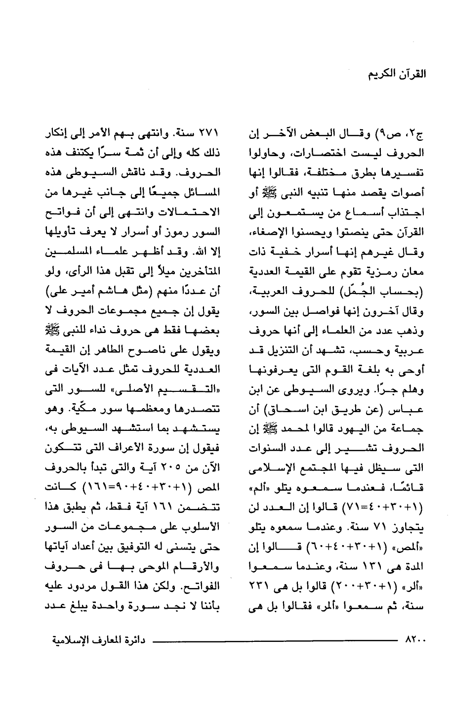 جـ 3، ص 9) وقال البعض الآخر إن الحروف ليست اختصارات، وحاولوا تفسيرها بطرق مختلفة، فقالوا إنها أصوات يقصد منها تنبيه النبى -صلى اللَّه عليه وسلم- أو اجتذاب أسماع من يستمعون إلى القرآن حتى ينصتوا ويحسنوا الإصغاء، وقال غيرهم إنها أسرار خفية ذات معان رمزية تقوم على القيمة العددية (بحساب الجُمل) للحروف العربية، وقال آخرون إنها فواصل بين السور، وذهب عدد من العلماء إلى أنها حروف عربية وحسب، تشهد أن التنزيل قد أوحى به بلغة القوم التى يعرفونها وهلم جرّا. ويروى السيوطى عن ابن عباس (عن طريق ابن اسحاق) أن جماعة من اليهود قالوا لمحمد -صلى اللَّه عليه وسلم- إن الحروف تشير إلى عدد السنوات التى سيظل فيها المجتمع الإسلامى قائمًا، فعندما سمعوه يتلو "ألم" (1 + 30 + 40 = 71) قالوا إن العدد لن يتجاوز 71 سنة. وعندما سمعوه يتلو "ألمص" (1 + 30 + 40 + 60) قالوا إن المدة هى 131 سنة، وعندما سمعوا "ألر" (1 + 30 + 200) قالوا بل هى 231 سنة، ثم سمعوا "ألمر" فقالوا بل هى 271 سنة. وانتهى بهم الأمر إلى إنكار ذلك كله وإلى أن ثمة سرًا يكتنف هذه الحروف. وقد ناقش السيوطى هذه المسائل جميعًا إلى جانب غيرها من الاحتمالات وانتهى إلى أن فواتح السور رموز أو أسرار لا يعرف تأويلها إلا اللَّه. وقد أظهر علماء المسلمين المتأخرين ميلًا إلى تقبل هذا الرأى، ولو أن عددًا منهم (مثل هاشم أمير على) يقول إن جميع مجموعات الحروف لا بعضها فقط هى حروف نداء للنبى -صلى اللَّه عليه وسلم- ويقول على ناصوح الطاهر إن القيمة العددية للحروف تمثل عدد الآيات فى "التقسيم الأصلى" للسور التى تتصدرها ومعظمها سور مكّية. وهو يستشهد بما استشهد السيوطى به، فيقول إن سورة الأعراف التى تتكون الآن من 305 آية والتى تبدأ بالحروف المص (1 + 30 + 40 + 90 = 161) كانت تتضمن 161 آية فقط، ثم يطبق هذا الأسلوب على مجموعات من السور حتى يتسنى له التوفيق بين أعداد آياتها والأرقام الموحى بها فى حروف الفواتح. ولكن هذا القول مردود عليه بأننا لا نجد سورة واحدة يبلغ عدد