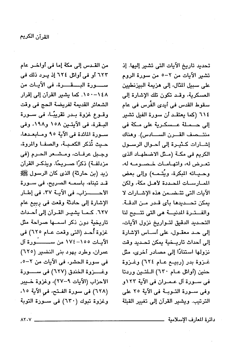 تحديد تاريخ الآيات التى تشير إليها. إذ تشير الآيات من 2 - 5 من سورة الروم على سبيل المثال، إلى هزيمة البيزنطيين العسكرية، وقد تكون تلك الإشارة إلى سقوط القدس فى أيدى الفرس فى عام 614 (كما يعتقد أن سورة الفيل تشير إلى حملة عسكرية على مكة فى منتصف القرن السادس). وهناك إشارات كثيرة إلى أحوال الرسول الكريم فى مكة (مثل الاضطهاد الذى تعرض له، واتهامات خصومه له، وحياته المبكرة، ويُتمه) وإلى بعض الممارسات المحددة لأهل مكة، ولكن الآيات التى تتضمن هذه الإشارات لا يمكن تحديدها بأى قدر من الدقة. والفترة المدنية هى التى تتيح لنا التحديد الدقيق لتواريخ نزول الآيات، إلى حد معقول، على أساس الإشارة إلى أحداث تاريخية يمكن تحديد وقت نزولها استنادًا إلى مصادر أخرى، مثل غزوة بدر (ربيع عام 624) وغزوة حنين (أوائل عام 630) اللتين وردتا فى سورة آل عمران فى الآية 123 وفى سورة التوبة فى الآية 25 على الترتيب. ويشير القرآن إلى تغيير القبلة من القدس إلى مكة إما فى أواخر عام 623 أو أوائل 624 إذ يرد ذلك فى سورة البقرة، فى الآيات من 148 - 150. كما يشير القرآن إلى إقرار الشعائر القديمة لفريضة الحج فى وقت وقوع غزوة بدر تقريبًا، فى سورة البقرة، فى الآيتين 158 و 198 وفى سورة المائدة فى الآية 95 وما بعدها، حيث تُذكر الكعبة، والصفا والمروة، وجبل عرفات، ومشعر الحرم (فى مزدلفة) ذكرًا صريحًا. ويذكر القرآن زيد (بن حارثة) الذى كان الرسول -صلى اللَّه عليه وسلم- قد تبناه، باسمه الصريح، فى سورة الأحزاب، فى الآية 37 فى إطار الإشارة إلى حادثة وقعت فى ربيع عام 627 كما يشير القرآن إلى أحداث تاريخية دون ذكر اسمها صراحة مثل غزوة أُحد (التى وقعت عام 625) فى الآيات 155 - 174 من سورة آل عمران، وطرد يهود بنى النضير (625) فى سورة الحشر، فى الآيات من 2 - 5, وغزوة الخندق (627) فى سورة الأحزاب (الآيات 9 - 27) وغزوة خيبر (628) فى سورة الفتح، فى الآية 15، وغزوة تبوك (630) فى سورة التوبة