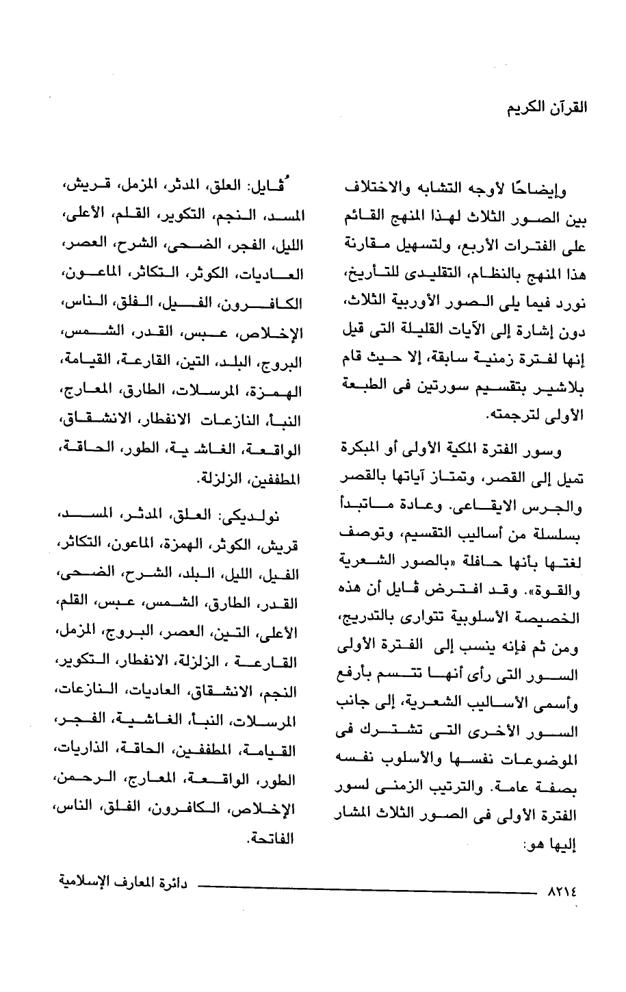 وإيضاحًا لأوجه التشابه والاختلاف بين الصور الثلاث لهذا المنهج القائم على الفترات الأربع، ولتسهيل مقارنة هذا المنهج بالنظام، التقليدى للتأريخ، نورد فيما يلى الصور الأوربية الثلاث، دون إشارة إلى الآيات القليلة التى قيل إنها لفترة زمنية سابقة، إلا حيث قام بلاشير بتقسيم سورتين فى الطبعة الأولى لترجمته.