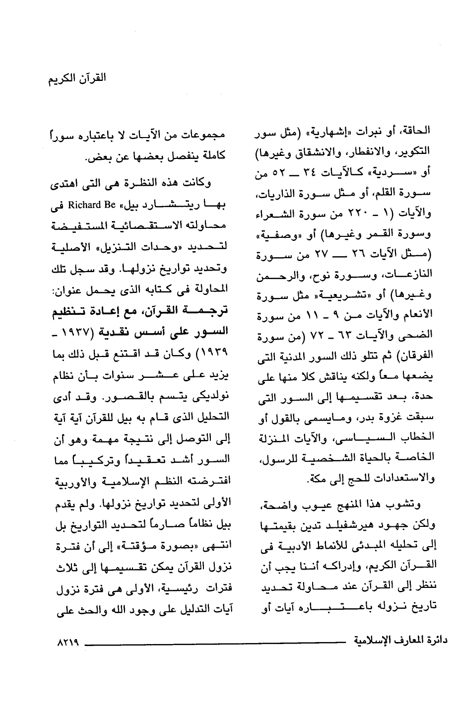 وكانت هذه النظرة هى التى اهتدى بها ريتشارد بيل Richard Be فى محاولته الاستقصائية المستفيضة لتحديد "وحدات التنزيل" الأصلية وتحديد تواريخ نزولها. وقد سجل تلك المحاولة فى كتابه الذى يحمل عنوان: ترجمة القرآن، مع إعادة تنظيم السور على أسس نقدية (1937 - 1939) وكان قد اقتنع قبل ذلك بما يزيد على عشر سنوات بأن نظام نولديكى يتسم بالقصور. وقد أدى التحليل الذى قام به بيل للقرآن آية آية إلى التوصل إلى نتيجة مهمة وهو أن السور أشد تعقيدًا وتركيبًا مما افترضته النظم الإسلامية والأوربية الأولى لتحديد تواريخ نزولها. ولم يقدم بيل نظامًا صارمًا لتحديد التواريخ بل انتهى "بصورة مؤقتة" إلى أن فترة نزول القرآن يمكن تقسيمها إلى ثلاث فترات رئيسية، الأولى هى فترة نزول آيات التدليل على وجود اللَّه والحث على