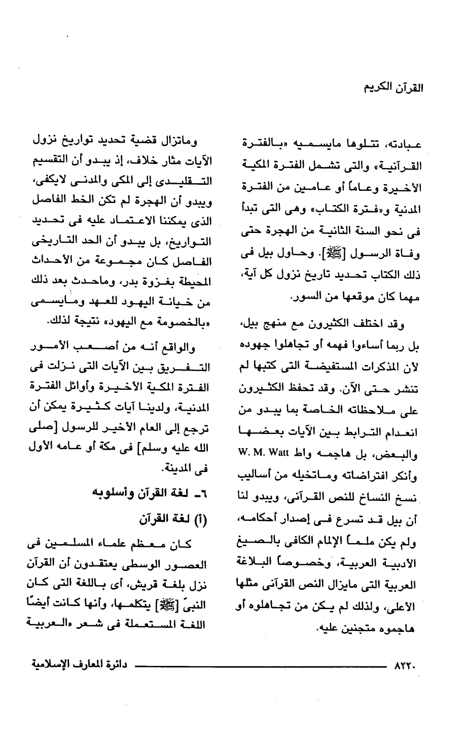 عبادته، تتلوها ما يسميه "بالفترة القرآنية" والتى تشمل الفترة المكية الأخيرة وعاما أو عامين من الفترة المدنية و"فترة الكتاب" وهى التى تبدأ فى نحو السنة الثانية من الهجرة حتى وفاة الرسول [-صلى اللَّه عليه وسلم-]. وحاول بيل فى ذلك الكتاب تحديد تاريخ نزول كل آية، مهما كان موقعها من السور.