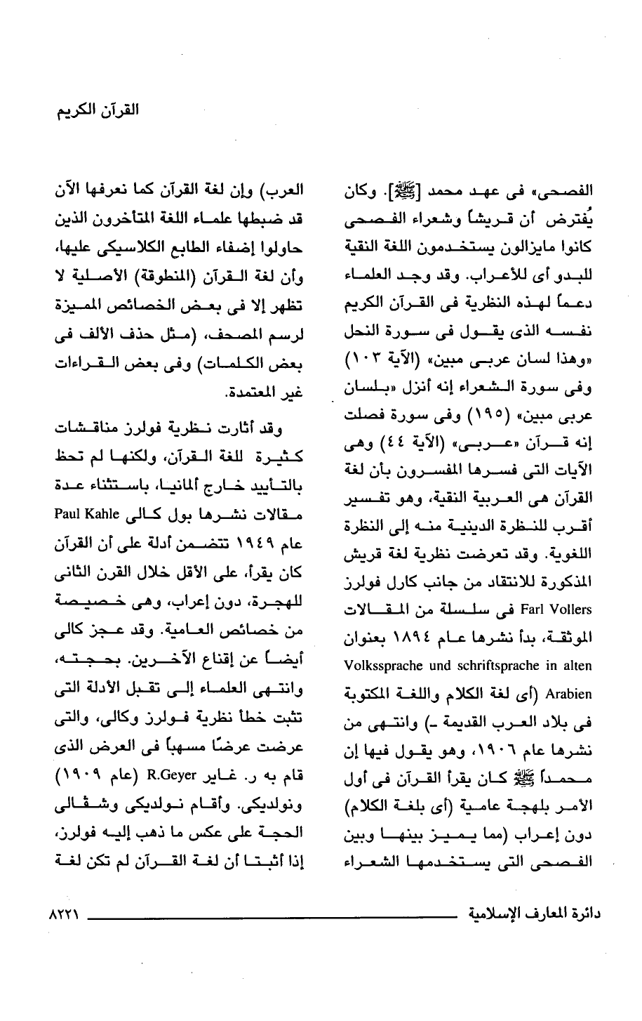 الفصحى" فى عهد محمد [-صلى اللَّه عليه وسلم-]. وكان يُفترض أن قريشًا وشعراء الفصحى كانوا ما يزالون يستخدمون اللغة النقية للبدو أى للأعراب. وقد وجد العلماء دعمًا لهذه النظرية فى القرآن الكريم نفسه الذى يقول فى سورة النحل {وَهَذَا لِسَانٌ عَرَبِيٌّ مُبِينٌ} (الآية 103) وفى سورة الشعراء إنه أنزل {بِلِسَانٍ عَرَبِيٍّ مُبِينٍ} (195) وفى سورة فصلت إنه قرآن "عربى" (الآية 44) وهى الآيات التى فسرها المفسرون بأن لغة القرآن هى العربية النقية، وهو تفسير أقرب للنظرة الدينية منه إلى النظرة اللغوية. وقد تعرضت نظرية لغة قريش المذكورة للانتقاد من جانب كارل فولرز Farl Vollers فى سلسلة من المقالات الموثقة، بدأ نشرها عام 1894 بعنوان Volkssprache und schriftsprache in alten Arabien (أى لغة الكلام واللغة المكتوبة فى بلاد العرب القديمة) وانتهى من نشرها عام 1906، وهو يقول فيها إن محمدًا -صلى اللَّه عليه وسلم- كان يقرأ القرآن فى أول الأمر بلهجة عامية (أى بلغة الكلام) دون إعراب (مما يميز بينها وبين الفصحى التى يستخدمها الشعراء العرب) وإن لغة القرآن كما نعرفها الآن قد ضبطها علماء اللغة المتأخرون الذين حاولوا إضفاء الطابع الكلاسيكى عليها، وأن لغة القرآن (المنطوقة) الأصلية لا تظهر إلا فى بعض الخصائص المميزة لرسم المصحف، (مثل حذف الألف فى بعض الكلمات) وفى بعض القراءات غير المعتمدة.