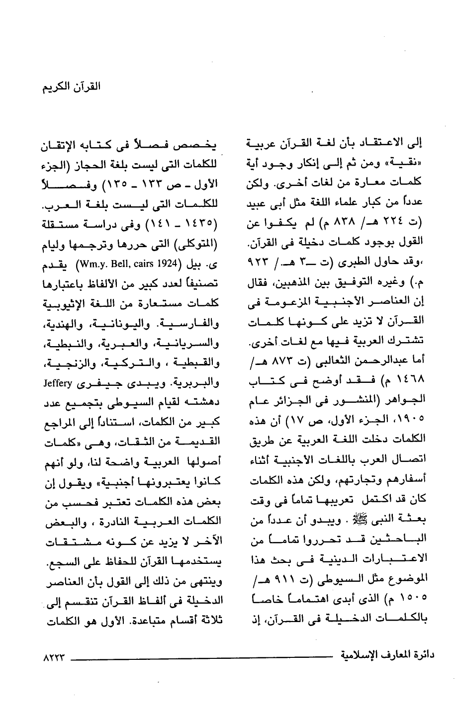 إلى الاعتقاد بأن لغة القرآن عربية "نقية" ومن ثم إلى إنكار وجود أية كلمات معارة من لغات أخرى. ولكن عددًا من كبار علماء اللغة مثل أبى عبيد (ت 224 هـ/ 838 م) لم يكفوا عن القول بوجود كلمات دخيلة فى القرآن. وقد حاول الطبرى (ت 3 هـ/ 923 م.) وغيره التوفيق بين المذهبين، فقال إن العناصر الأجنبية المزعومة فى القرآن لا تزيد على كونها كلمات تشترك العربية فيها مع لغات أخرى. أما عبد الرحمن الثعالبى (ت 873 هـ/ 1468 م) فقد أوضح فى كتاب الجواهر (المنشور فى الجزائر عام 1905، الجزء الأول، ص 17) أن هذه الكلمات دخلت اللغة العربية عن طريق اتصال العرب باللغات الأجنبية أثناء أسفارهم وتجارتهم، ولكن هذه الكلمات كان قد اكتمل تعريبها تمامًا فى وقت بعثة النبى -صلى اللَّه عليه وسلم-. ويبدو أن عددًا من الباحثين قد تحرروا تمامًا من الاعتبارات الدينية فى بحث هذا الموضوع مثل السيوطى (ت 911 هـ/ 1505 م) الذى أبدى اهتمامًا خاصًا بالكلمات الدخيلة فى القرآن، إذ يخصص فصلًا فى كتابه الإتقان للكلمات التى ليست بلغة الحجاز (الجزء الأول - ص 133 - 135) وفصلًا للكلمات التى ليست بلغة العرب. (1435 - 141) وفى دراسة مستقلة (المتوكلى) التى حررها وترجمها وليام ى. بيل (1924 Wm.y. Bell, cairs) يقدم تصنيفا لعدد كبير من الألفاظ باعتبارها كلمات مستعارة من اللغة الإثيوبية والفارسية. واليونانية، والهندية، والسريانية، والعبرية، والنبطية، والقبطية، والتركية، والزنجية، والبربرية. ويبدى جيفرى Jeffery دهشته لقيام السيوطى بتجميع عدد كبير من الكلمات، استنادًا إلى المراجع القديمة من الثقات، وهى "كلمات أصولها العربية واضحة لنا، ولو أنهم كانوا يعتبرونها أجنبية" ويقول إن بعض هذه الكلمات تعتبر فحسب من الكلمات العربية النادرة، والبعض الآخر لا يزيد عن كونه مشتقات يستخدمها القرآن للحفاظ على السجع. وينتهى من ذلك إلى القول بأن العناصر الدخيلة فى ألفاظ القرآن تنقسم إلى ثلاثة أقسام متباعدة. الأول هو الكلمات