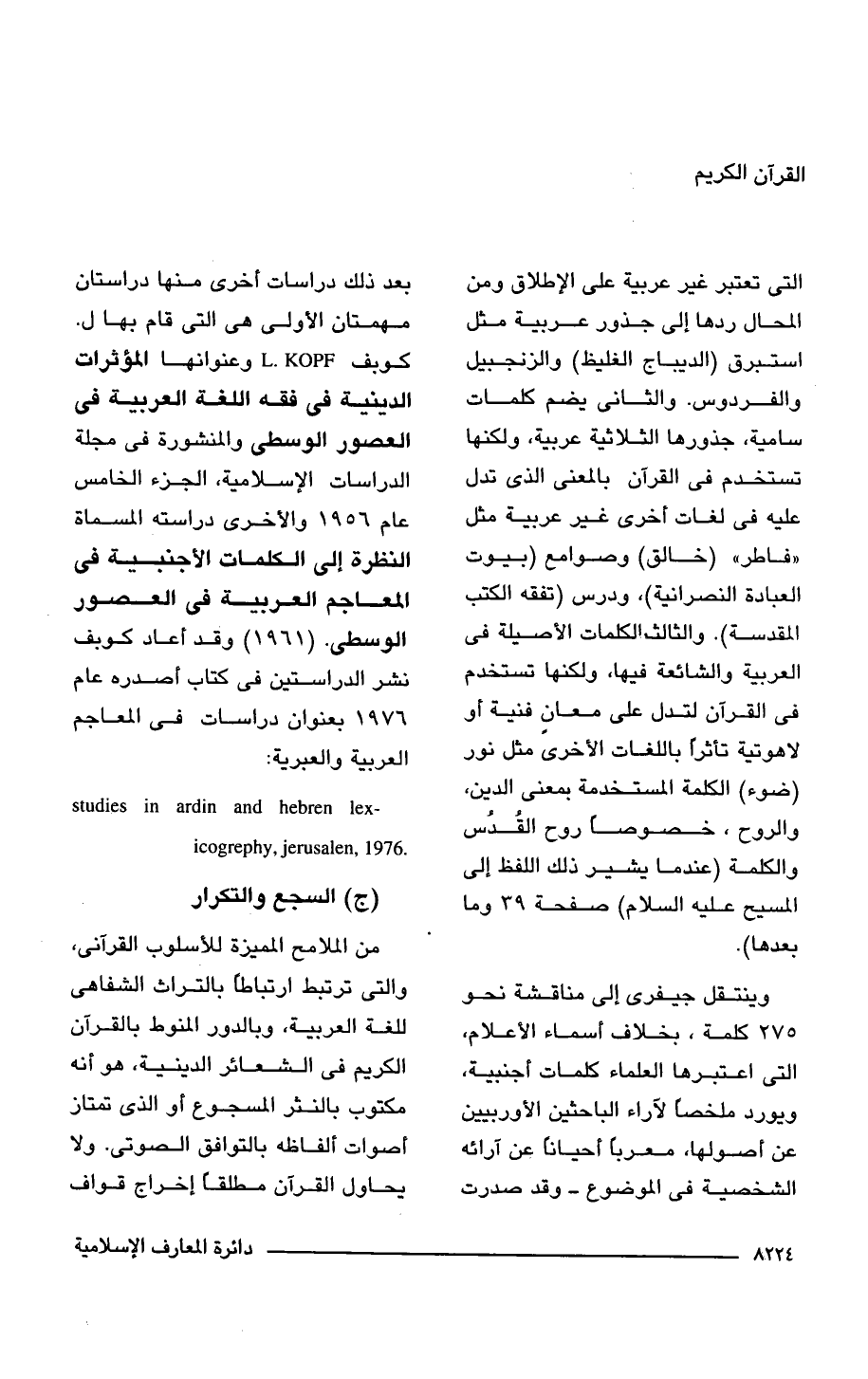 التى تعتبر غير عربية على الإطلاق ومن المحال ردها إلى جذور عربية مثل استبرق (الديباج الغليظ) والزنجبيل والفردوس. والثانى يضم كلمات سامية، جذورها الثلاثية عربية، ولكنها تستخدم فى القرآن بالمعنى الذى تدل عليه فى لغات أخرى غير عربية مثل "فاطر" (خالق) وصوامع (بيوت العبادة النصرانية)، ودرس (تفقه الكتب المقدسة). والثالثه الكلمات الأصيلة فى العوبية والشائعة فيها، ولكنها تستخدم فى القرآن لتدل على معانٍ فنية أو لاهوتية تأثرًا باللغات الأخرى مثل نور (ضوء) الكلمة المستخدمة بمعنى الدين، والروح، خصوصا روح القُدُس والكلمة (عندما يشير ذلك اللفظ إلى المسيح عليه السلام) صفحة 39 وما بعدها).