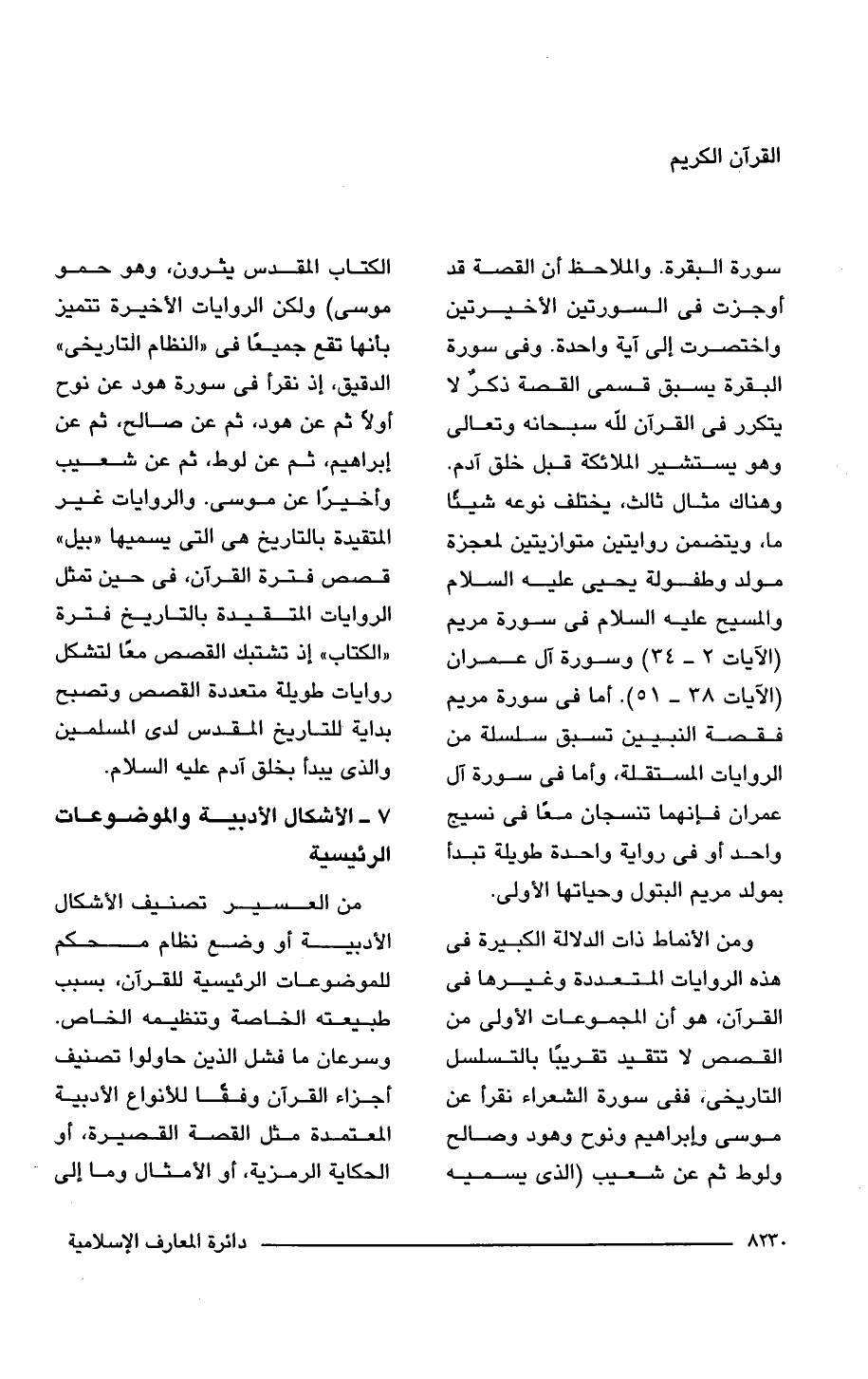 سورة البقرة. والملاحظ أن القصة قد أوجزت فى السورتين الأخيرتين واختصرت إلى آية واحدة. وفى سورة البقرة يسبق قسمى القصة ذكرٌ لا يتكرر فى القرآن للَّه سبحانه وتعالى وهو يستشير الملائكة قبل خلق آدم. وهناك مثال ثالث، يختلف نوعه شيئًا ما، ويتضمن روايتين متوازيتين لمعجزة مولد وطفولة يحيى عليه السلام والمسيح عليه السلام فى سورة مريم (الآيات 2 - 34) وسورة آل عمران (الآيات 38 - 51). أما فى سورة مريم فقصة النبيين تسبق سلسلة من الروايات المستقلة، وأما فى سورة آل عمران فإنهما تنسجان معًا فى نسيج واحد أو فى رواية واحدة طويلة تبدأ بمولد مريم البتول وحياتها الأولى.