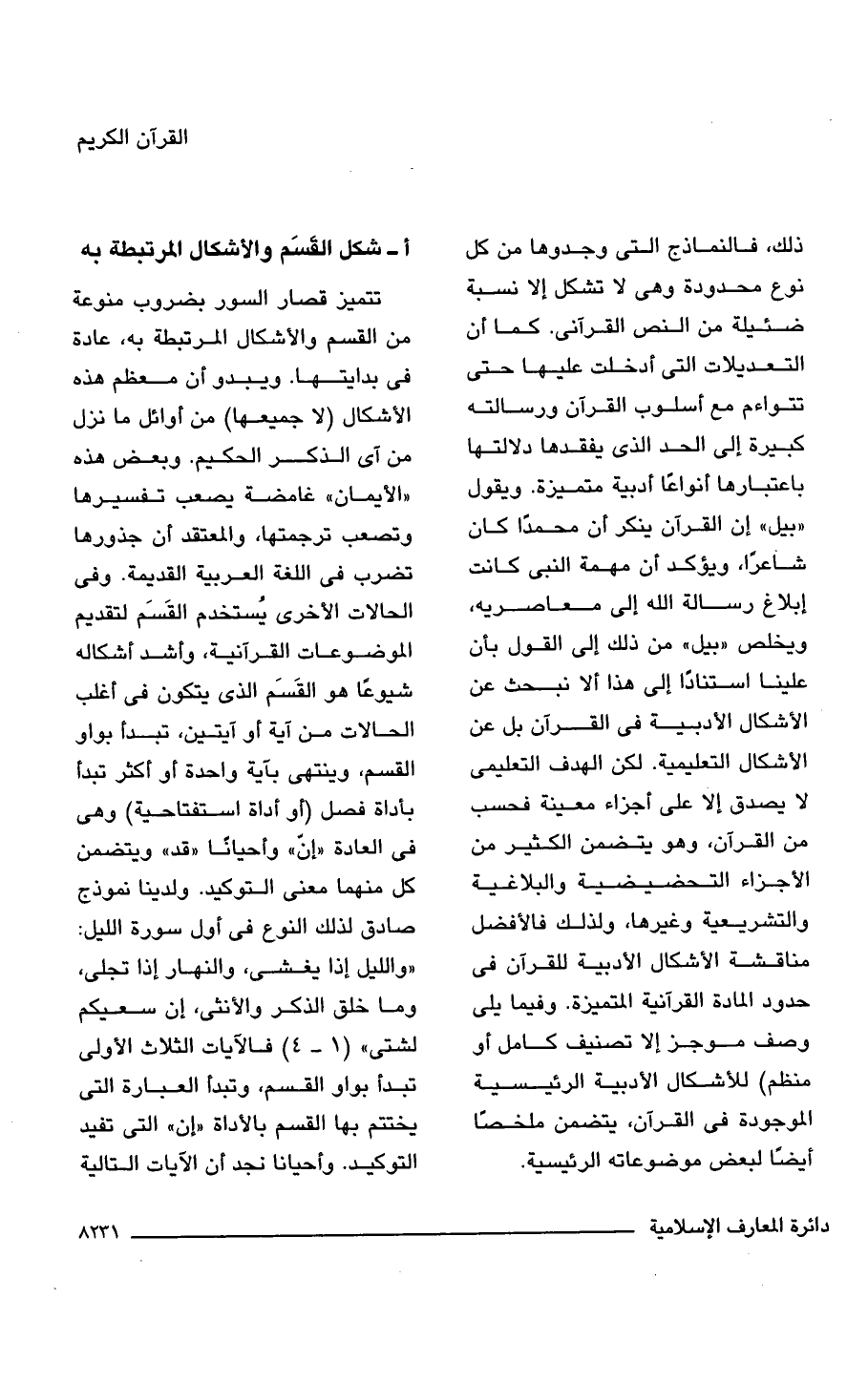 ذلك، فالنماذج التى وجدوها من كل نوع محدودة وهى لا تشكل إلا نسبة ضئيلة من النص القرآنى. كما أن التعديلات التى أدخلت عليها حتى تتواءم مع أسلوب القرآن ورسالته كبيرة إلى الحد الذى يفقدها دلالتها باعتبارها أنواعًا أدبية متميزة. ويقول "بيل" إن القرآن ينكر أن محمدًا كان شاعرًا، ويؤكد أن مهمة النبى كانت إبلاغ رسالة اللَّه إلى معاصريه، ويخلص "بيل" من ذلك إلى القول بأن علينا استنادًا إلى هذا ألا نبحث عن الأشكال الأدبية فى القرآن بل عن الأشكال التعليمية. لكن الهدف التعليمى لا يصدق إلا على أجزاء معينة فحسب من القرآن، وهو يتضمن الكثير من الأجزاء التحضيضية والبلاغية والتشريعية وغيرها، ولذلك فالأفضل مناقشة الأشكال الأدبية للقرآن فى حدود المادة القرآنية المتميزة. وفيما يلى وصف موجز إلا تصنيف كامل أو منظم) للأشكال الأدبية الرئيسية الموجودة فى القرآن، يتضمن ملخصًا أيضًا لبعض موضوعاته الرئيسية.