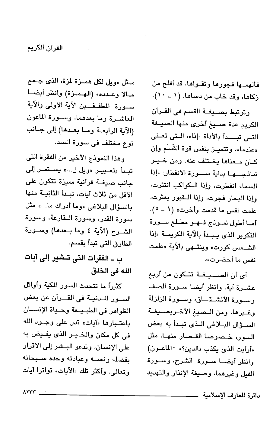 وهذا النموذج الأخير من الفقرة التى تبدأ بتعبير "ويل ل. . . " يستمر إلى جانب صيغة قرآنية مميزة تتكون على الأقل من ثلاث آيات، تبدأ الثانية منها بالسؤال البلاغى "وما أدراك ما. . . " مثل سورة القدر، وسورة القارعة، وسورة الشرح (الآية 4 وما بعدها) وسورة الطارق التى تبدأ بقسم.
