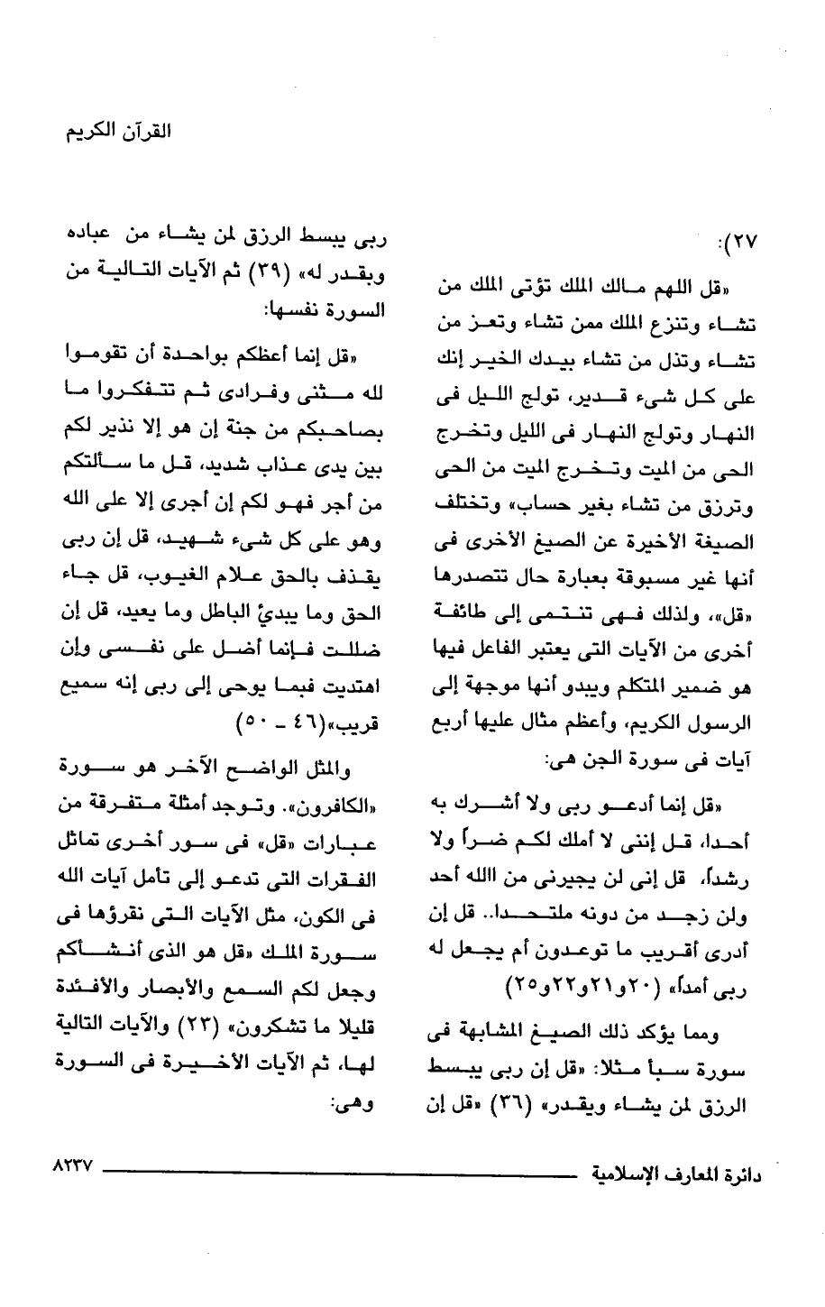 {قُلِ اللَّهُمَّ مَالِكَ الْمُلْكِ تُؤْتِي الْمُلْكَ مَنْ تَشَاءُ وَتَنْزِعُ الْمُلْكَ مِمَّنْ تَشَاءُ وَتُعِزُّ مَنْ تَشَاءُ وَتُذِلُّ مَنْ تَشَاءُ بِيَدِكَ الْخَيْرُ إِنَّكَ عَلَى كُلِّ شَيْءٍ قَدِيرٌ (26) تُولِجُ اللَّيْلَ فِي النَّهَارِ وَتُولِجُ النَّهَارَ فِي اللَّيْلِ وَتُخْرِجُ الْحَيَّ مِنَ الْمَيِّتِ وَتُخْرِجُ الْمَيِّتَ مِنَ الْحَيِّ وَتَرْزُقُ مَنْ تَشَاءُ بِغَيْرِ حِسَابٍ (27)} وتختلف الصيغة الأخيرة عن الصيغ الأخرى فى أنها غير مسبوقة بعبارة حال تتصدرها "قل"، ولذلك فهى تنتمى إلى طائفة أخرى من الآيات التى يعتبر الفاعل فيها هو ضمير المتكلم ويبدو أنها موجهة إلى الرسول الكريم، وأعظم مثال عليها أربع آيات فى سورة الجن هى: