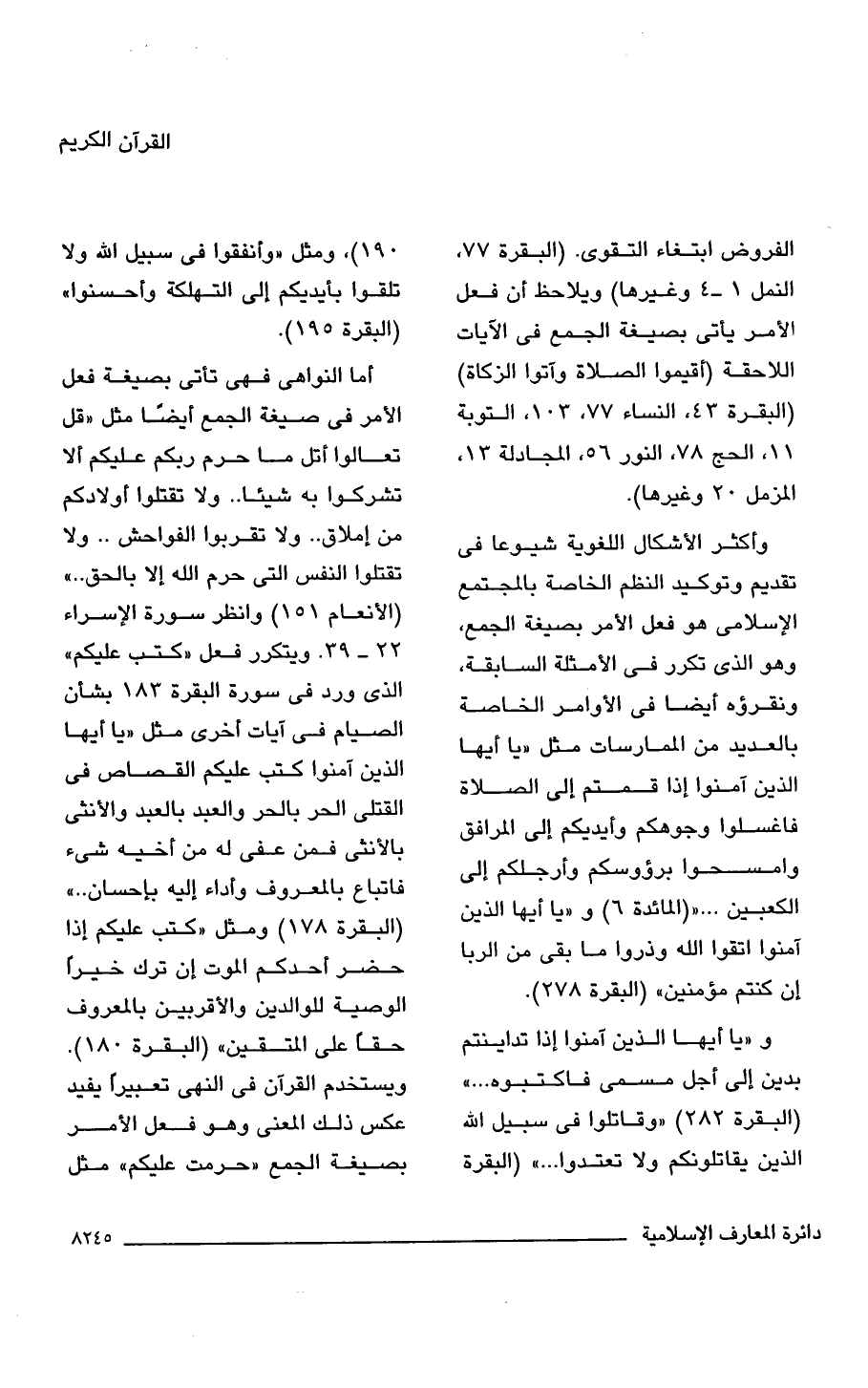 وأكثر الأشكال اللغوية شيوعًا فى تقديم وتوكيد النظم الخاصة بالمجتمع الإسلامى هو فعل الأمر بصيغة الجمع، وهو الذى تكرر فى الأمثلة السابقة، ونقرؤه أيضا فى الأوامر الخاصة بالعديد من الممارسات مثل {يَاأَيُّهَا الَّذِينَ آمَنُوا إِذَا قُمْتُمْ إِلَى الصَّلَاةِ فَاغْسِلُوا وُجُوهَكُمْ وَأَيْدِيَكُمْ إِلَى الْمَرَافِقِ وَامْسَحُوا بِرُءُوسِكُمْ وَأَرْجُلَكُمْ إِلَى الْكَعْبَيْنِ. .} (المائدة 6) و {يَاأَيُّهَا الَّذِينَ آمَنُوا اتَّقُوا اللَّهَ وَذَرُوا مَا بَقِيَ مِنَ الرِّبَا إِنْ كُنْتُمْ مُؤْمِنِينَ} (البقرة 278).