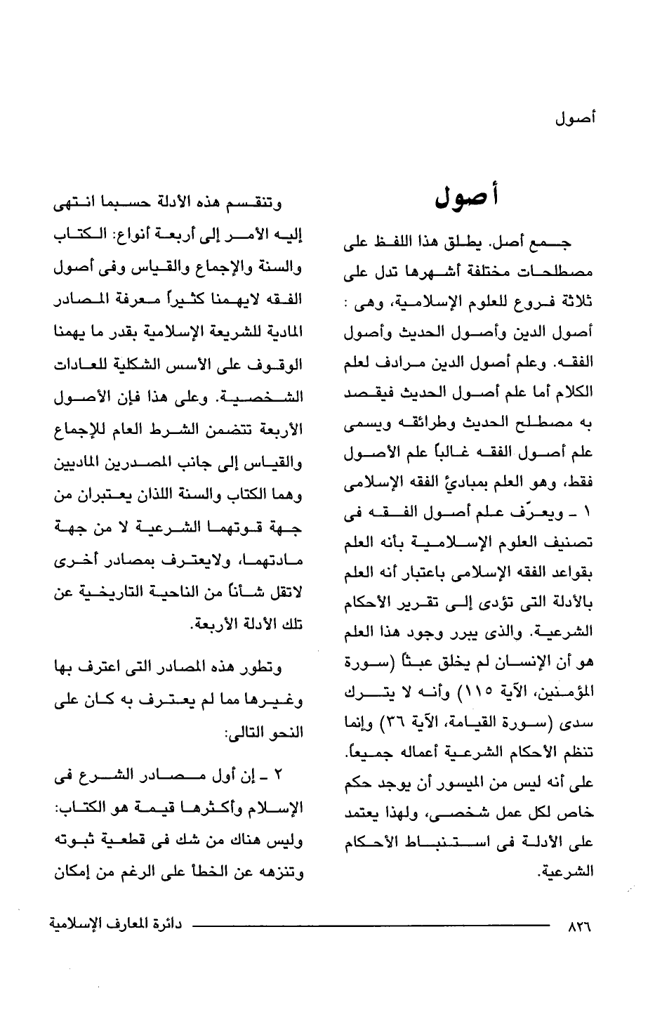 1 - ويعرّف علم أصول الفقه فى تصنيف العلوم الإسلامية بأنه العلم بقواعد الفقه الإسلامى باعتبار أنه العلم بالأدلة التى تؤدى إلى تقرير الأحكام الشرعية. والذى يبرر وجود هذا العلم هو أن الإنسان لم يخلق عبثًا (سورة المؤمنين، الآية 115) وأنه لا يترك سدى (سورة القيامة، الآية 36) وإنما تنظم الأحكام الشرعية أعماله جميعًا. على أنه ليس من الميسور أن يوجد حكم خاص لكل عمل شخصى، ولهذا يعتمد على الأدلة فى استنباط الأحكام الشرعية.