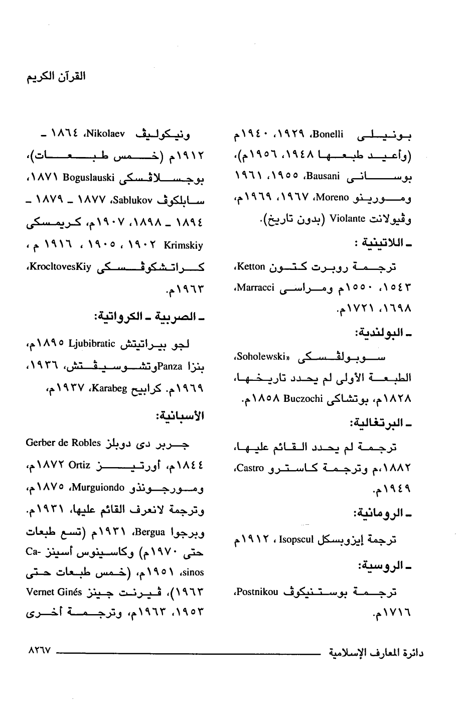 ونيكوليف Nikolaev، 1864 - 1912 م (خمس طبعات)، بوجسلافسكى Boguslauski, 1871, سابلكوف Sahinkov، 1877 - 1879 - 1894 - 1898, 1907 م, كريمسكى Krimskiy، 1902, 1905, 1916 م, كراتشكوفسكى KrocltovesKiy، 1963 م.