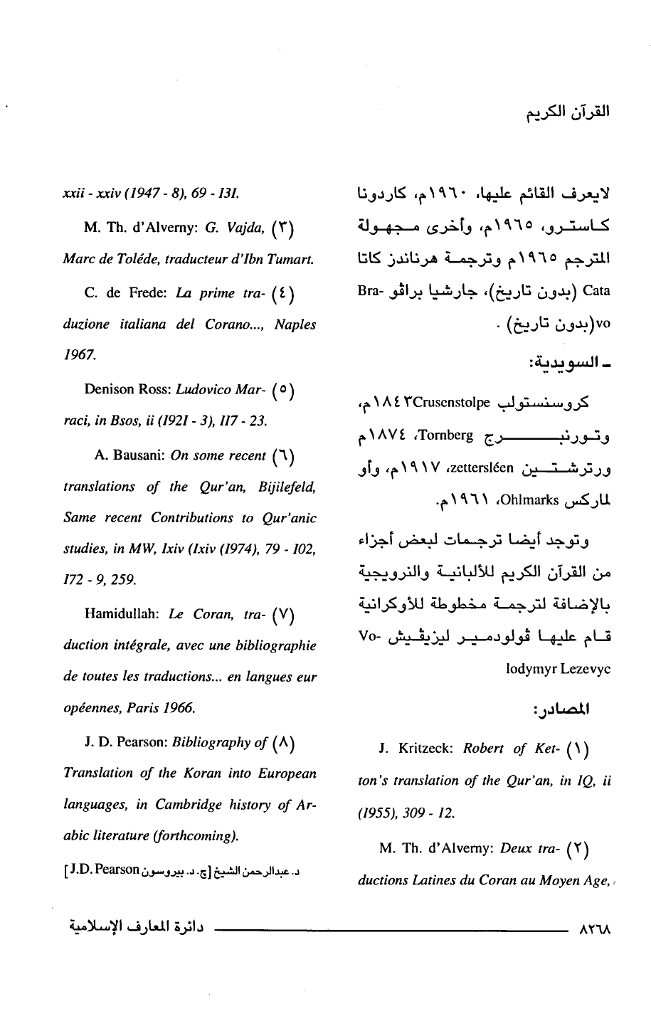 (8) J. D. Pearson: Bibliography of Translation of the Koran into European languages, in Cambridge history of Arabic literature (forthcoming)