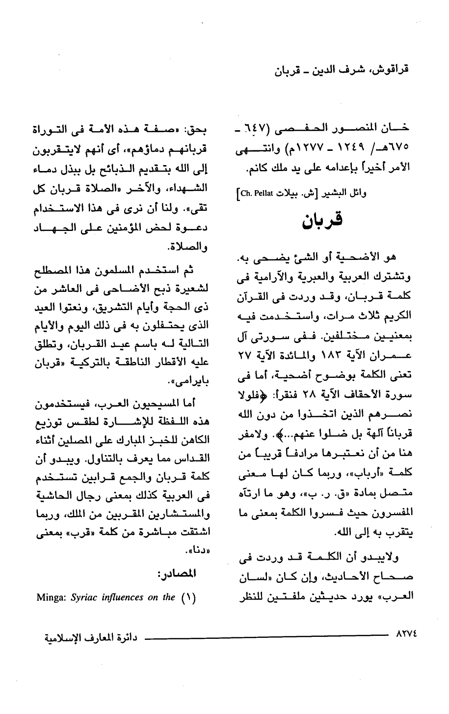 هو الأضحية أو الشئ يضحى به. وتشترك العربية والعبرية والآرامية فى كلمة قربان، وقد وردت فى القرآن الكريم ثلاث مرات، واستخدمت فيه بمعنيين مختلفين. ففى سورتى آل عمران الآية 183 والمائدة الآية 27 تعنى الكلمة بوضوح أضحية، أما فى سورة الأحقاف الآية 28 فنقرأ: {فَلَوْلَا نَصَرَهُمُ الَّذِينَ اتَّخَذُوا مِنْ دُونِ اللَّهِ قُرْبَانًا آلِهَةً بَلْ ضَلُّوا عَنْهُمْ. . .}. ولا مفر هنا من أن نعتبرها مرادفًا قريبًا من كلمة "أرباب"، وربما كان لها معنى متصل بمادة "ق. ر. ب"، وهو ما ارتآه المفسرون حيث فسروا الكلمة بمعنى ما يتقرب به إلى اللَّه.