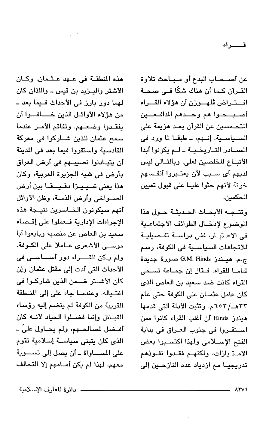 عن أصحاب البدع أو مباحث تلاوة القرآن كما أن هناك شكًّا فى صحة افتراض فلهوزن أن هؤلاء القراء أصبحوا هم وحدهم المدافعين المتحمسين عن القرآن بعد هزيمة على السياسية. إنهم، -طبقا لما ورد فى المصادر التاريخية- لم يكونوا أبدا الأتباع المخلصين لعلى، وبالتالى ليس لديهم أى سبب لأن يعتبروا أنفسهم خونة لأنهم حثوا عليا على قبول تعيين الحكمين.