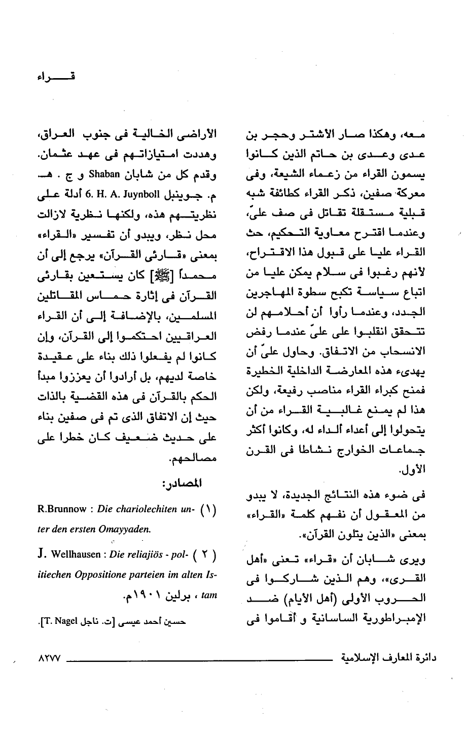 معه، وهكذا صار الأشتر وحجر بن عدى وعدى بن حاتم الذين كانوا يسمون القراء من زعماء الشيعة، وفى معركة صفين، ذكر القراء كطائفة شبه قبلية مستقلة تقاتل فى صف على، وعندما اقترح معاوية التحكيم، حث القراء عليا على قبول هذا الاقتراح، لأنهم رغبوا فى سلام يمكن عليا من اتباع سياسة تكبح سطوة المهاجرين الجدد، وعندما رأوا أن احلامهم لن تتحقق انقلبوا على علىّ عندما رفض الانسحاب من الاتفاق. وحاول علىّ أن يهدئ هذه المعارضة الداخلية الخطيرة فمنح كبراء القراء مناصب رفيعة، ولكن هذا لم يمنع غالبية القراء من أن يتحولوا إلى أعداء ألداء له، وكانوا أكثر جماعات الخوارج نشاطا فى القرن الأول.