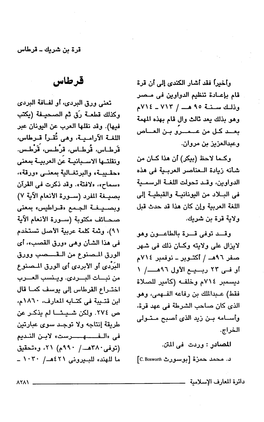 تعنى ورق البردى، أو لفافة البردى وكذلك قطعة رَق ثم الصحيفة (يكتب فيها). وقد نقلها العرب عن اليونان عبر اللغة الآرامية، وهى تُقرأ قرطاس، قَرطاس، قُرطاس، قِرْطس، قَرْطس. ونقلتها الاسبانية عَن العربية بمعنى "حقيبة" والبرتغالية بمعنى "ورقة"، "سماح" "لافتة". وقد ذكرت فى القرآن بصيغة المفرد (سورة الأنعام الآية 7) وبصيغة الجمع "قراطيس" بمعنى صحائف مكتوبة (سورة الأنعام الآية 91)، وثمة كلمة عربية الأصل تستخدم فى هذا الشأن وهى "ورق القصب"، أى الورق المصنوع من القصب وورق البَرْدى أو الأبردى أى الورق المصنوع من نبات البردى. وينسب العرب اختراع القرطاس إلى يوسف كما قال ابن قتيبة فى كتابه المعارف، 1860 م، ص 274. ولكن شيئًا لم يذكر عن طريقة إنتاجه ولا توجد سوى عبارتين فى "الفهرست" لابن النديم (توفى 380 هـ/ 990 م) 21، و"تحقيق ما للهند" للبيرونى 421 هـ/ 1030 -