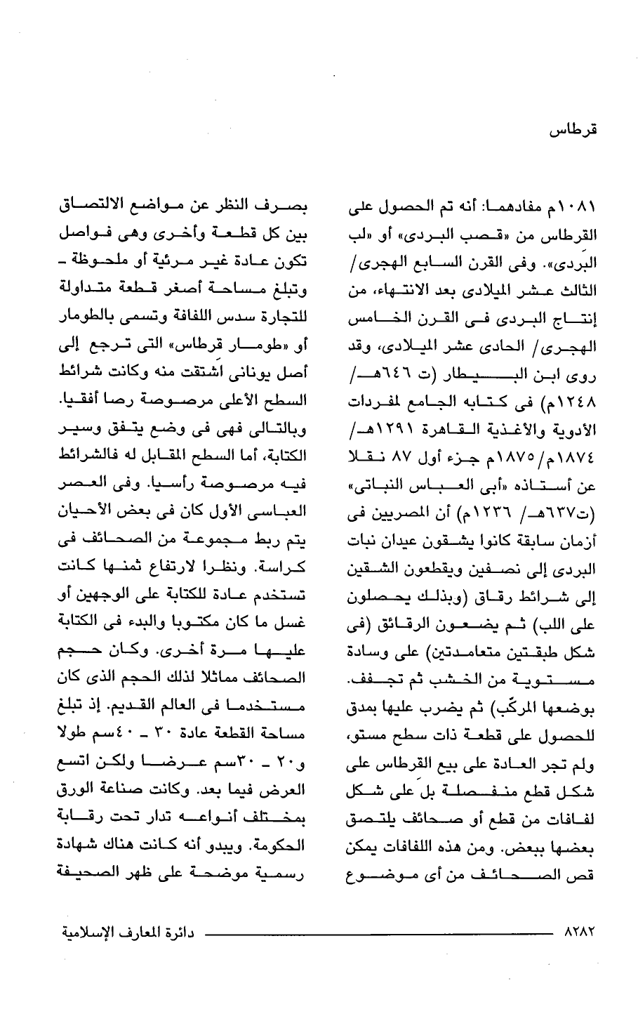 1081 م مفادهما: أنه تم الحصول على القرطاس من "قصب البردى" أو "لب البردى". وفى القرن السابع الهجرى/ الثالث عشر الميلادى بعد الانتهاء، من إنتاج البردى فى القرن الخامس الهجرى/ الحادى عشر الميلادى، وقد روى ابن البيطار (ت 646 هـ/ 1248 م) فى كتابه الجامع لمفردات الأدوية والأغذية القاهرة 1291 هـ/ 1874 م/ 1875 م جزء أول 87 نقلا عن أستاذه "أبى العباس النباتى" (ت 637 هـ/ 1236 م) أن المصريين فى أزمان سابقة كانوا يشقون عيدان نبات البردى إلى نصفين ويقطعون الشقين إلى شرائط رقاق (وبذلك يحصلون على اللب) ثم يضعون الرقائق (فى شكل طبقتين متعامدتين) على وسادة مستوية من الخشب ثم تجفف. بوضعها المركّب) ثم يضرب عليها بمدق للحصول على قطعة ذات سطح مستو، ولم تجر العادة على بيع القِرطاس على شكل قطع منفصلة بل على شكل لفافات من قطع أو صحائف يلتصق بعضها ببعض. ومن هذه اللفافات يمكن قص الصحائف من أى موضوع بصرف النظر عن مواضع الالتصاق بين كل قطعة وأخرى وهى فواصل تكون عادة غير مرئية أو ملحوظة -وتبلغ مساحة أصغر قطعة متداولة للتجارة سدس اللفافة وتسمى بالطومار أو "طومار قِرطاس" التى ترجع إلى أصل يونانى اشتقت منه وكانت شرائط السطح الأعلى مرصوصة رصا أفقيا. وبالتالى فهى فى وضع يتفق وسير الكتابة، أما السطح المقابل له فالشرائط فيه مرصوصة رأسيا. وفى العصر العباسى الأول كان فى بعض الأحيان يتم ربط مجموعة من الصحائف فى كراسة. ونظرا لارتفاع ثمنها كانت تستخدم عادة للكتابة على الوجهين أو غسل ما كان مكتوبا والبدء فى الكتابة عليها مرة أخرى. وكان حجم الصحائف مماثلا لذلك الحجم الذى كان مستخدما فى العالم القديم. إذ تبلغ مساحة القطعة عادة 30 - 40 سم طولا و 20 - 30 سم عرضا ولكن اتسع العرض فيما بعد. وكانت صناعة الورق بمختلف أنواعه تدار تحت رقابة الحكومة. ويبدو أنه كانت هناك شهادة رسمية موضحة على ظهر الصحيفة