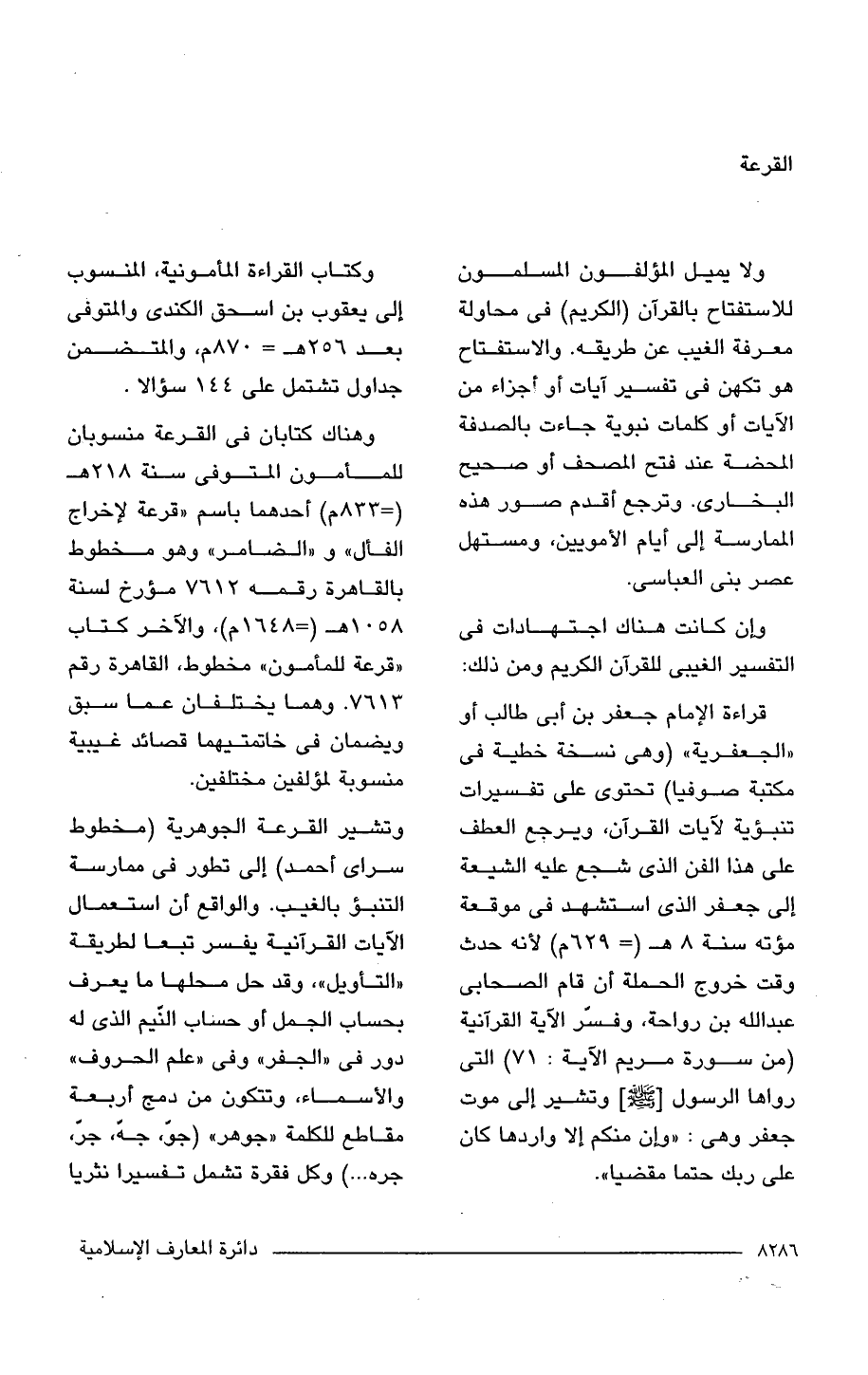 وإن كانت هناك اجتهادات فى التفسير الغيبى للقرآن الكريم ومن ذلك: قراءة الإمام جعفر بن أبى طالب أو "الجعفرية" (وهى نسخة خطية فى مكتبة صوفيا) تحتوى على تفسيرات تنبؤية لآيات القرآن، ويرجع العطف على هذا الفن الذى شجع عليه الشيعة إلى جعفر الذى استشهد فى موقعة مؤته سنة 8 هـ (= 629 م) لأنه حدث وقت خروج الحملة أن قام الصحابى عبد اللَّه بن رواحة، وفسّر الآية القرآنية (من سورة مريم الآية: 71) التى رواها الرسول [-صلى اللَّه عليه وسلم-] وتشير إلى موت جعفر وهى: {وَإِنْ مِنْكُمْ إِلَّا وَارِدُهَا كَانَ عَلَى رَبِّكَ حَتْمًا مَقْضِيًّا}.