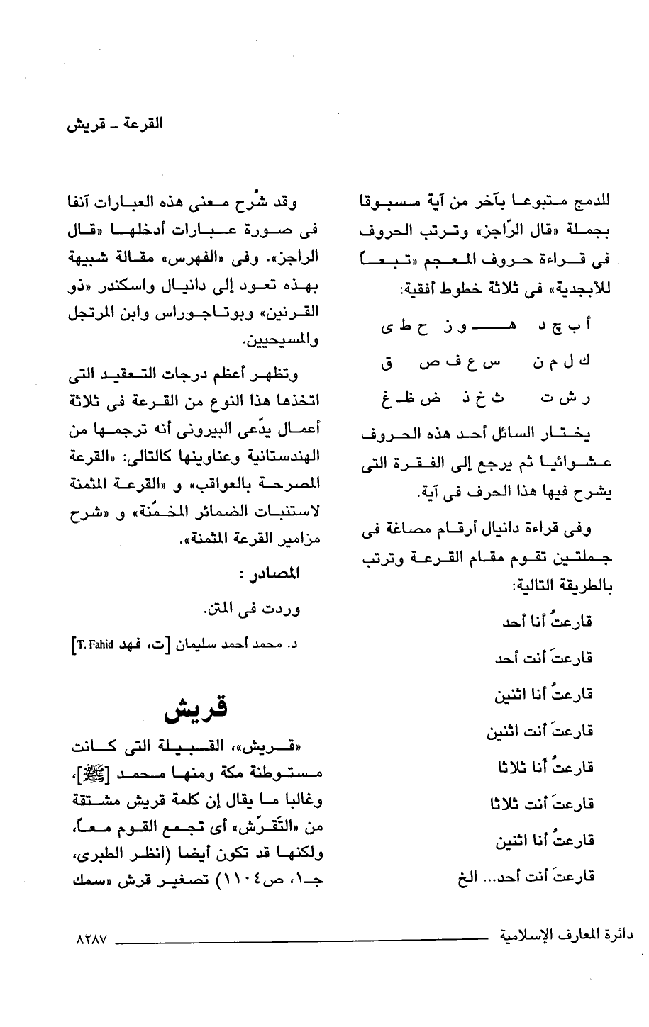 " قريش"، القبيلة التى كانت مستوطنة مكة ومنها محمد [-صلى اللَّه عليه وسلم-]، وغالبا ما يقال إن كلمة قريش مشتقة من "التَقرّش" أى تجمع القوم معا، ولكنها قد تكون أيضا (انظر الطبرى، جـ 1، ص 1104) تصغير قرش "سمك