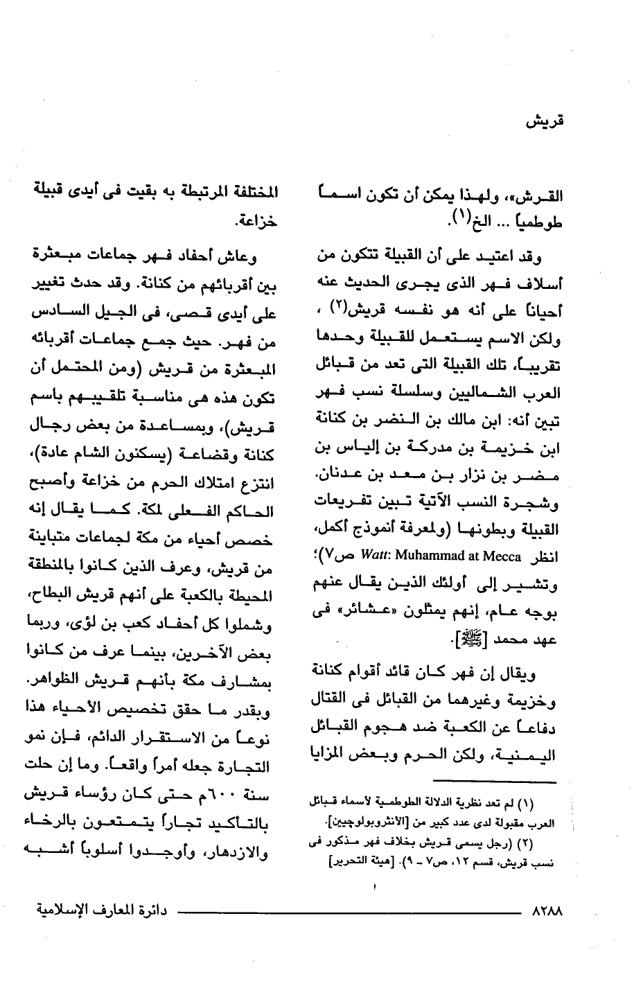 وقد اعتيد على أن القبيلة تتكون من أسلاف فهر الذى يجرى الحديث عنه أحيانًا على أنه هو نفسه قريش (¬2)، ولكن الاسم يستعمل للقبيلة وحدها تقريبًا، تلك القبيلة التى تعد من قبائل العرب الشماليين وسلسلة نسب فهر تبين أنه: ابن مالك بن النضر بن كنانة ابن خزيمة بن مدركة بن إلياس بن مضر بن نزار بن معد بن عدنان. وشجرة النسب الآتية تبين تفريعات القبيلة وبطونها (ولمعرفة أنموذج أكمل، انظر Watt: Muhammad at Mecca ص 7): وتشير إلى أولئك الذين يقال عنهم بوجه عام، إنهم يملكون "عشائر" فى عهد محمد [-صلى اللَّه عليه وسلم-].
