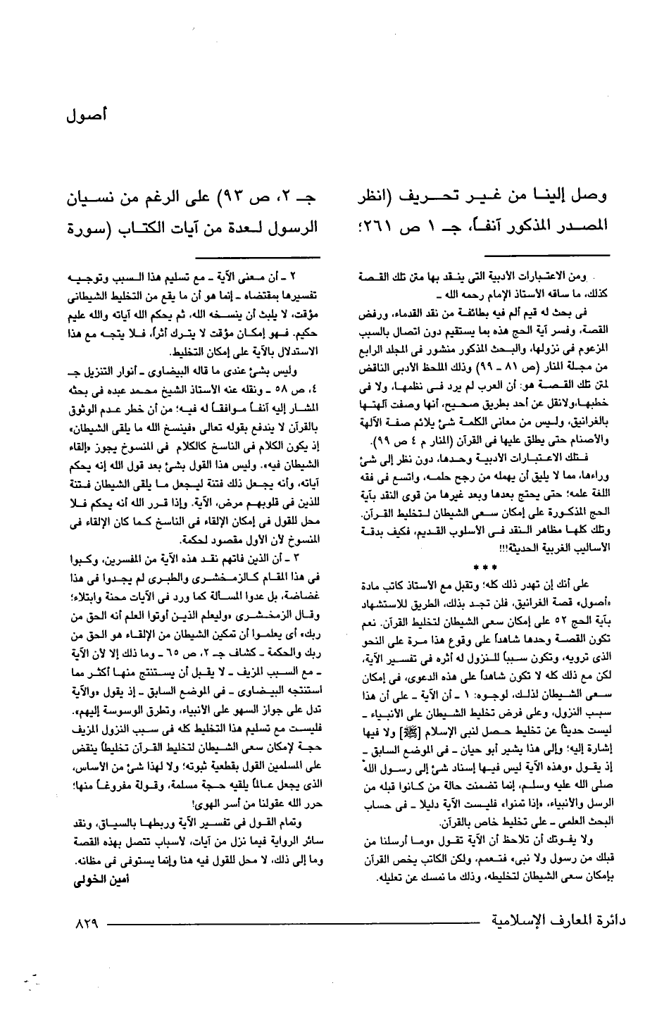 على أنك إن تهدر ذلك كله؛ وتقبل مع الأستاذ كاتب مادة "أصول " قصة الغرانيق، فلن تجد بذلك، الطريق للاستشهاد بآية الحج 52 على إمكان سعى الشيطان لتخليط القرآن. نعم تكون القصة وحدها شاهدًا على وقوع هذا مرة على النحو الذى ترويه، وتكون سببًا للنزول له أثره فى تفسير الآية، لكن مع ذلك كله لا تكون شاهدًا على هذه الدعوى، فى إمكان سعى الشيطان لذلك، لوجوه: