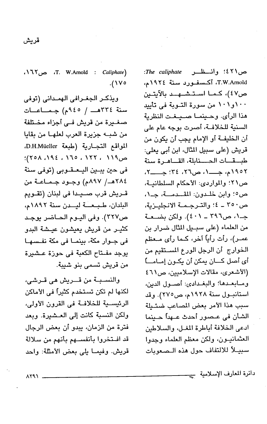ص 421؛ وانظر T.W.Arnold: The caliphate، أكسفورد سنة 1924 م، ص 47)، كما استشهد بالآيتين 100 و 101 من سورة التوبة فى تأييد هذا الرأى. وحينما صيغت النظرية السنية للخلافة، أصرت بوجه عام على أن الخليفة أو الإمام يجب أن يكون من قريش (على سبيل المثال، ابن أبى يعلى: طبقات الحنابلة، القاهرة سنة 1952 م، جـ 1، ص 26، 34؛ جـ 2، ص 21؛ والمواردى: الأحكام السلطانية، ص 5؛ وابن خلدون: المقدمة، جـ 1، ص 350 - 4؛ والترجمة الانجليزية، جـ 1، ص 396 - 401). ولكن بضعة من العلماء (على سبيل المثال ضرار بن عمر)، رأت رأيًا آخر، كما رأى معظم الخوارج أن الرجل الورع المستقيم من أى أصل كان يمكن أن يكون إمامًا (الأشعرى، مقالات الإسلاميين، ص 461 وما بعدها؛ والبغداد: أصول الدين، استانبول سنة 1928 م، ص 275). وقد سبب هذا الأمر بعض المصاعب ضئيلة الشأن فى عصور أحدث عهدًا حينما ادعى الخلافة أباطرة المغل، والسلاطين العثمانيون، ولكن معظم العلماء وجدوا سبيلًا للالتفاف حول هذه الصعوبات (T. W.Arnold: Caliphate, ص 162, 175).