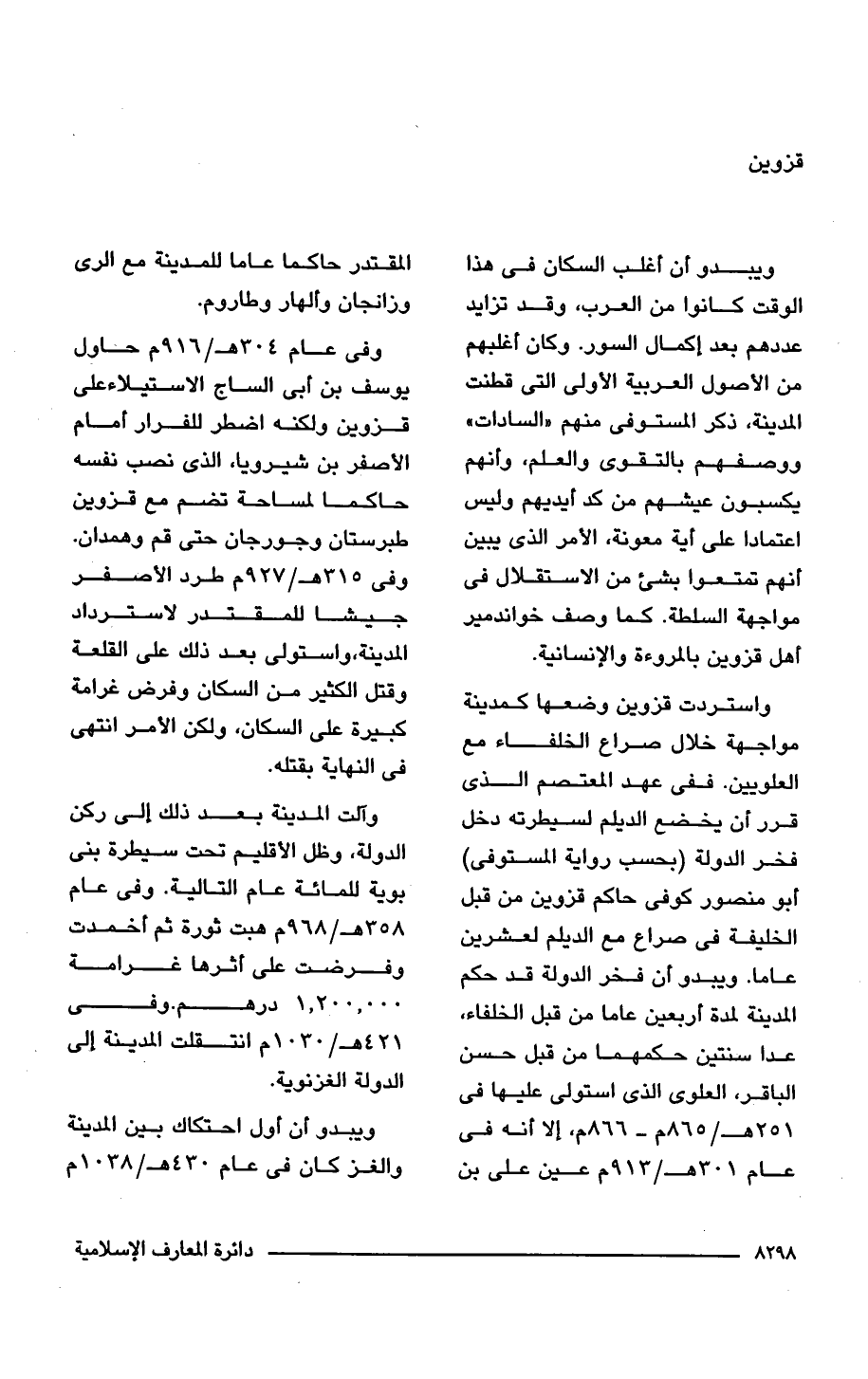 واستردت قزوين وضعها كمدينة مواجهة خلال صراع الخلفاء مع العلويين. ففى عهد المعتصم الذى قرر أن يخضع الديلم لسيطرته دخل فخر الدولة (بحسب رواية المستوفى) أبو منصور كوفى حاكم قزوين من قبل الخليفة فى صراع مع الديلم لعشرين عاما. ويبدو أن فخر الدولة قد حكم المدينة لمدة أربعين عاما من قبل الخلفاء، عدا سنتين حكمهما من قبل حسن الباقر، العلوى الذى استولى عليها فى 251 هـ/ 865 - 866 م، إلا أنه فى عام 301 هـ/ 913 م عين على بن المقتدر حاكما عاما للمدينة مع الرى وزانجان وألهار وطاروم.