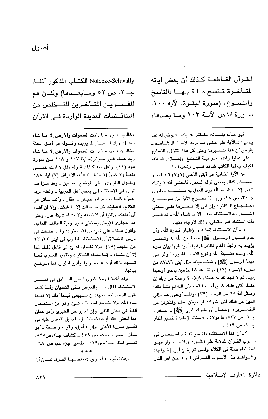 فهو عالم بنسيانه، مغتفر له إياه، معوض له عما ينسى؛ فالآية على عكس ما يريد الأستاذ شاهدة -بفرض أن هذا تفسيرها وعلى كل هذا التنزل والتسليم - على عناية زائدة بمراقبة التبليغ، وإصلاح شأنه، فكيف جعلها الكاتب شاهد نسيان وتحريف! ! ! عن الآية الثانية فى آيتى الأعلى (6 و 7) قد فسر النسيان كذلك بمعنى ترك العمل، فالمعنى أنه لا يترك العمل إلا بما شاء الله ترك العمل به فينسخه- طبرى جـ 30، ص 98، وبهذا تخرج الآية من موضوع احتجاج الكاتب " وإن أبى إلا قصرها على معنى النسيان، فالاستثناء منه -إلا ما شاء الله- قد فسر بأنه استثناء غير حقيقى، وذلك لأوجه، منها: