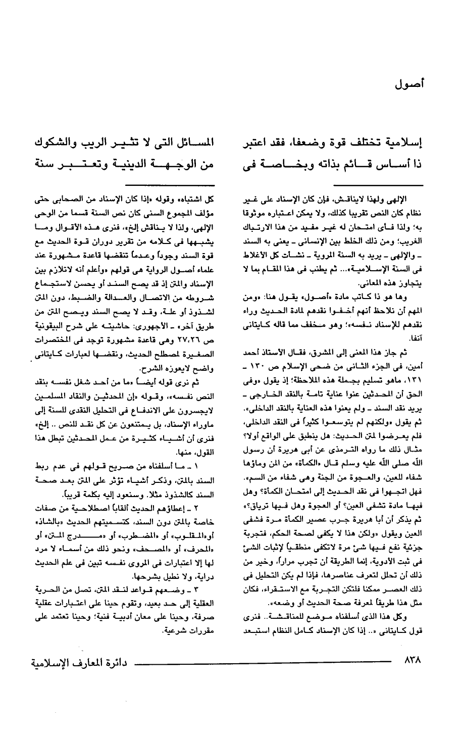 وها هو ذا كاتب مادة "أصول" يقول هنا: "ومن المهم أن نلاحظ أنهم أخفوا نقدهم لمادة الحديث وراء نقدهم للإسناد نفسه"؛ وهو مخفف مما قاله كايتانى آنفا.