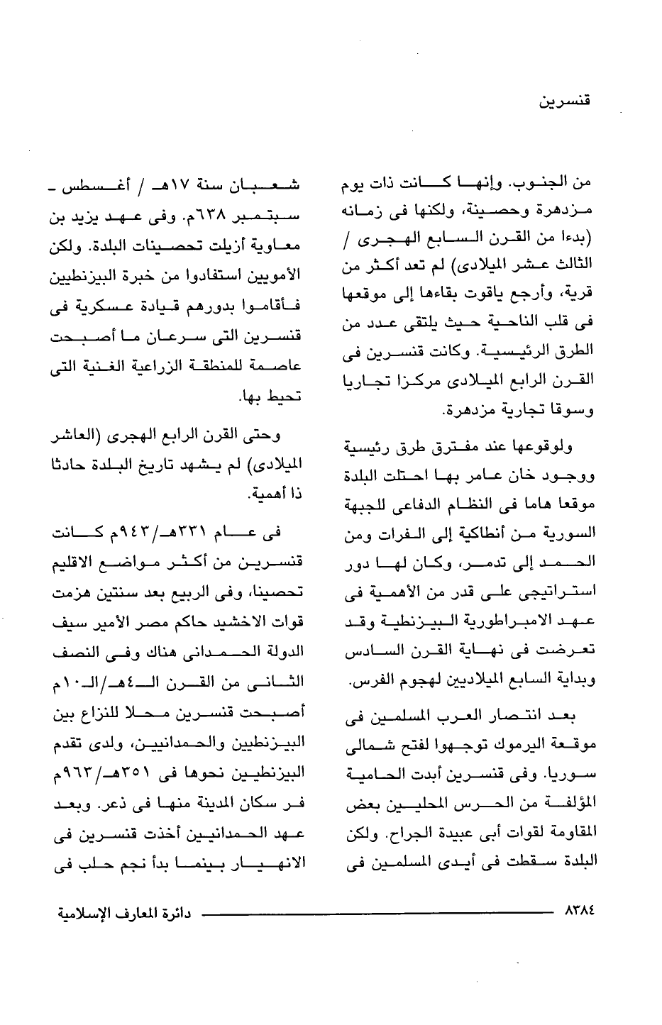 من الجنوب. وإنها كانت ذات يوم مزدهرة وحصينة، ولكنها فى زمانه (بدءا من القرن السابع الهجرى/ الثالث عشر الميلادى) لم تعد أكثر من قرية، وأرجع ياقوت بقاءها إلى موقعها فى قلب الناحية حيث يلتقى عدد من الطرق الرئيسية. وكانت قنسرين فى القرن الرابع الميلادى مركزا تجاريا وسوقا تجارية مزدهرة.