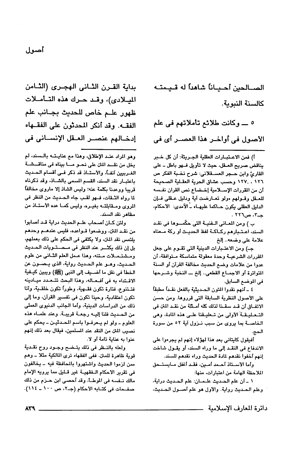 5 - وكانت طلائع تأملاتهم فى علم الأصول فى أواخر هذا العصر أى فى بداية القرن الثانى الهجرى (الثامن الميلادى)، وقد حرك هذه التأملات ظهور علم خاص للحديث بجانب علم الفقه. وقد أنكر المحدثون على الفقهاء إدخالهم عنصر العقل الإنسانى فى