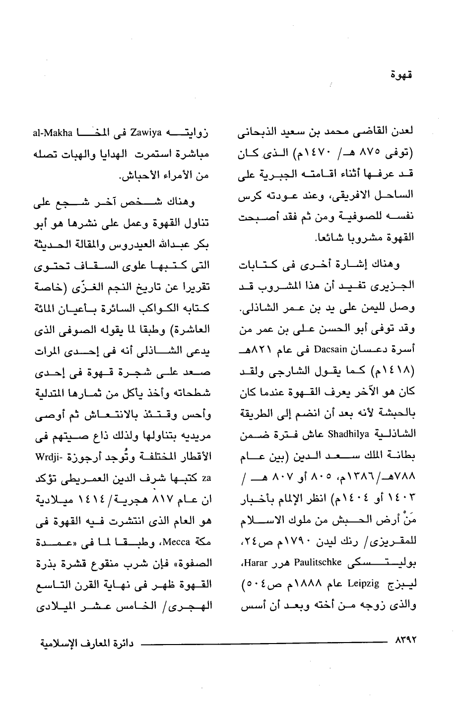 وهناك إشارة أخرى فى كتابات الجزيرى تفيد أن هذا المشروب قد وصل لليمن على يد بن عمر الشاذلى. وقد توفى أبو الحسن على بن عمر من أسرة دعسان Dacsain فى عام 821 هـ (1418 م) كما يقول الشارجى ولقد كان هو الآخر يعرف القهوة عندما كان بالحبشة لأنه بعد أن انضم إلى الطريقة الشاذلية Shadhilya عاش فترة ضمن بطانة الملك سعد الدين (بين عام 788 هـ/ 1386 م، 805 أو 807 هـ/ 1403 أو 1404 م) انظر الإلمام بأخبار مَنْ أرض الحبش من ملوك الإسلام للمقريزى/ رنك ليدن 1790 م ص 24، بوليتسكى Paulitschke هرر Harar ليبزج Leipzig عام 1888 م ص 504) والذى زوجه من أخته وبعد أن أسس زوايته Zawiya فى المخا al-Makha مباشرة استمرت الهدايا والهبات تصله من الأمراء الأحباش.