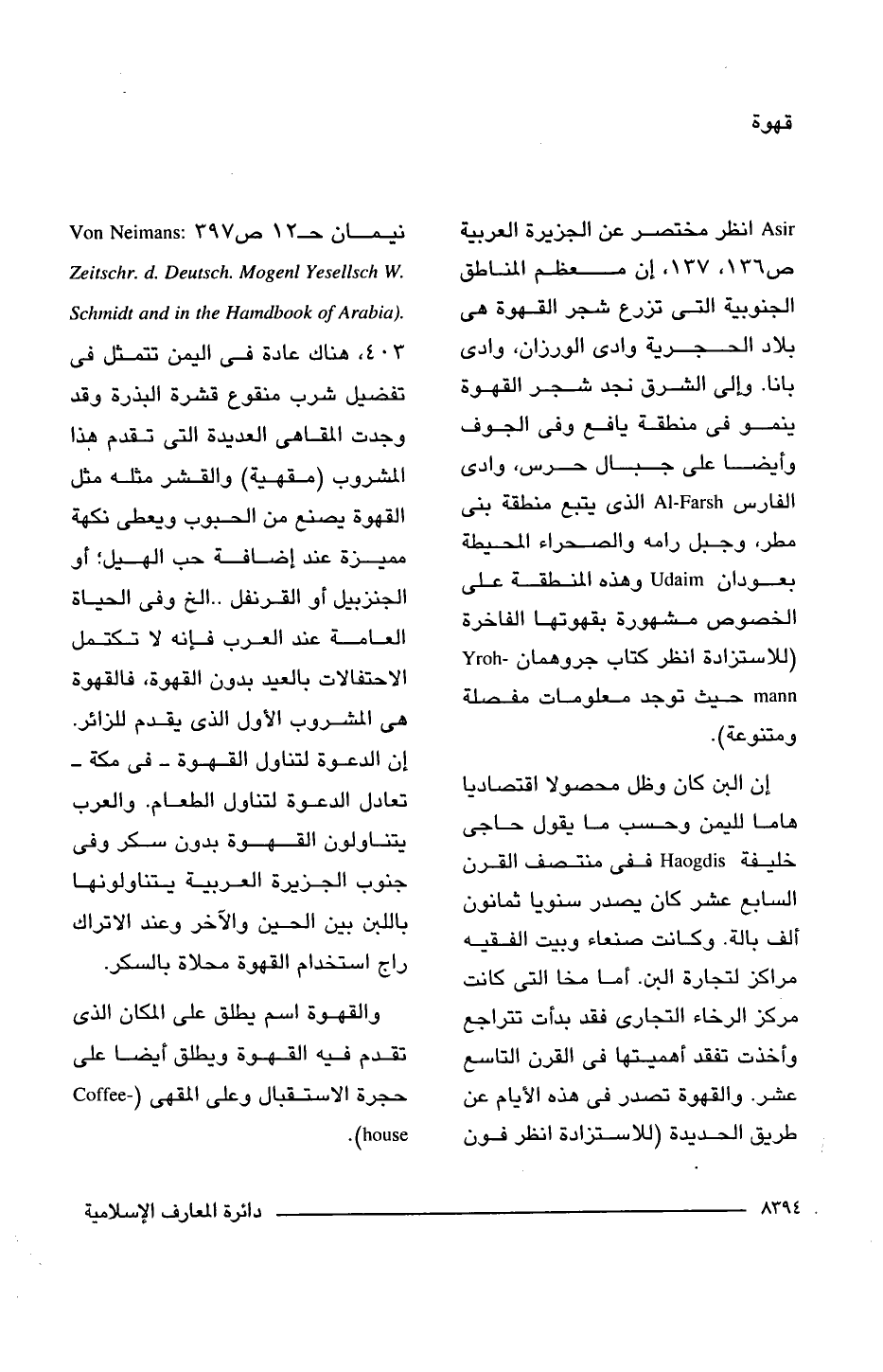 Asir انظر مختصر عن الجزيرة العربية ص 136, 137, إن معظم المناطق الجنوبية التى تزرع شجر القهوة هى بلاد الحجرية وادى الورزان، وادى بانا. وإلى الشرق نجد شجر القهوة ينمو فى منطقة يافع وفى الجوف وأيضا على جبال حرس، وادى الفارس Al-Farsh الذى يتبع منطقة بنى مطر، وجبل رامه والصحراء المحيطة بعودان Udaim وهذه المنطقة على الخصوص مشهورة بقهوتها الفاخرة (للاستزادة انظر كتاب جروهمان Yrohmann حيث توجد معلومات مفصلة ومتنوعة).