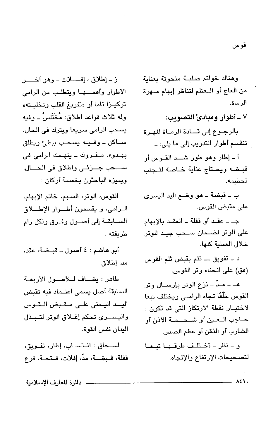 ز- إطلاق، إفلات -وهو آخر الأطوار وأهمها ويتطلب من الرامى تركيزا تاما أو "تفريغ القلب وتخليته" وله ثلاث قواعد اطلاق: مُخَتَلسْ -وفيه يسحب الرامى سريعا ويترك فى الحال. ساكن -وفيه يسحب ببطئ ويطلق بهدوء. مفروك -ينهمك الرامى فى سحب جزئى واطلاق فى الحال. ويميزه الباحثون بخمسة أركان: