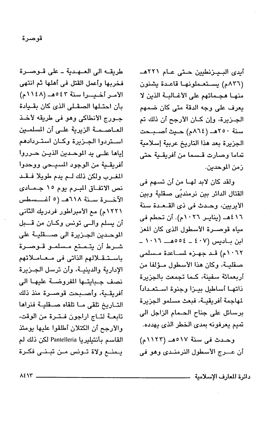 طريقه إلى العهدية - على قوصرة فخربها وأعمل القتل فى أهلها ثم انتهى الأمر أخيرا سنة 543 هـ (1148 م) بأن احتلها الصقلى الذى كان بقيادة جورج الأنطاكى وهو فى طريقه لأخذ العاصمة الزيرية على أن المسلمين استردوا الجزيرة وكان استردادهم إياها على يد الموحدين الذين حرروا أفريقية من الوجود المسيحى ووحدوا المغرب ولكن ذلك لم يدم طويلا فقد نص الاتفاق المبرم يوم 15 جمادى الآخرة سنة 618 هـ (5 أغسطس 1221 م) مع الأمبراطور فردريك الثانى أن يسلم والى تونس وكان من قبل الموحدين الجزيرة إلى صقلية على شرط أن يتمتع مسلمو قوصرة باستقلالهم الذاتى فى معاملاتهم الإدارية والدينية، وأن ترسل الجزيرة نصف جبايتها المفروضة عليها إلى أفريقية، وأصبحت قوصرة منذ ذلك التاريخ تلقى ما تلقاه صقلية فنراها تابعة لتاج اراجون فترة من الوقت, والأرجح أن الكتلان أطلقوا عليها يومئذ القاسم بأنتيليريا Pantelleria لكن ذلك لم يمنع ولاة تونس من تبنى فكرة