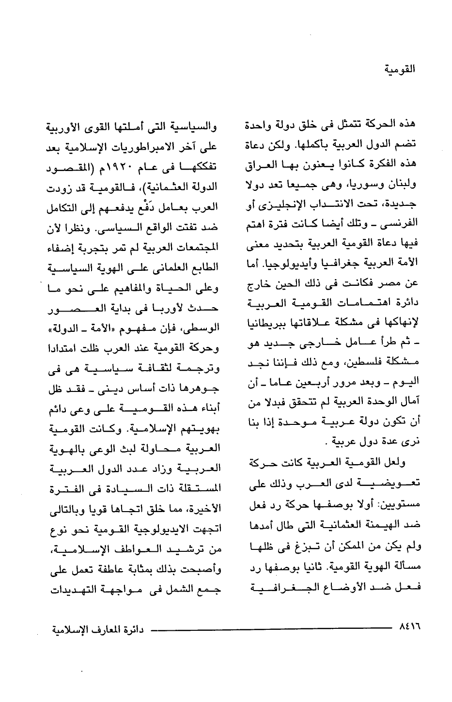 ولعل القومية العربية كانت حركة تعويضية لدى العرب وذلك على مستويين: أولا بوصفها حركة رد فعل ضد الهيمنة العثمانية التى طال أمدها ولم يكن من الممكن أن تبزغ فى ظلها مسألة الهوية القومية. ثانيا بوصفها رد فعل ضد الأوضاع الجغرافية والسياسية التى أملتها القوى الأوربية على آخر الامبراطوريات الإسلامية بعد تفككها فى عام 1920 م (المقصود الدولة العثمانية)، فالقومية قد زودت العرب بعامل دَفْع يدفعهم إلى التكامل ضد تفتت الواقع السياسى. ونظرا لأن المجتمعات العربية لم تمر بتجربة إضفاء الطابع العلمانى على الهوية السياسية وعلى الحياة والمفاهيم على نحو ما حدث لأوربا فى بداية العصور الوسطى، فإن مفهوم "الأمة - الدولة" وحركة القومية عند العرب ظلت امتدادا وترجمة لثقافة سياسية هى فى جوهرها ذات أساس دينى - فقد ظل أبناء هذه القومية على وعى دائم بهويتهم الإسلامية. وكانت القومية العربية محاولة لبث الوعى بالهوية العربية وزاد عدد الدول العربية المستقلة ذات السيادة فى الفترة الأخيرة، مما خلق اتجاها قويا وبالتالى اتجهت الايديولوجية القومية نحو نوع من ترشيد العواطف الإسلامية، وأصبحت بذلك بمثابة عاطفة تعمل على جمع الشمل فى مواجهة التهديدات