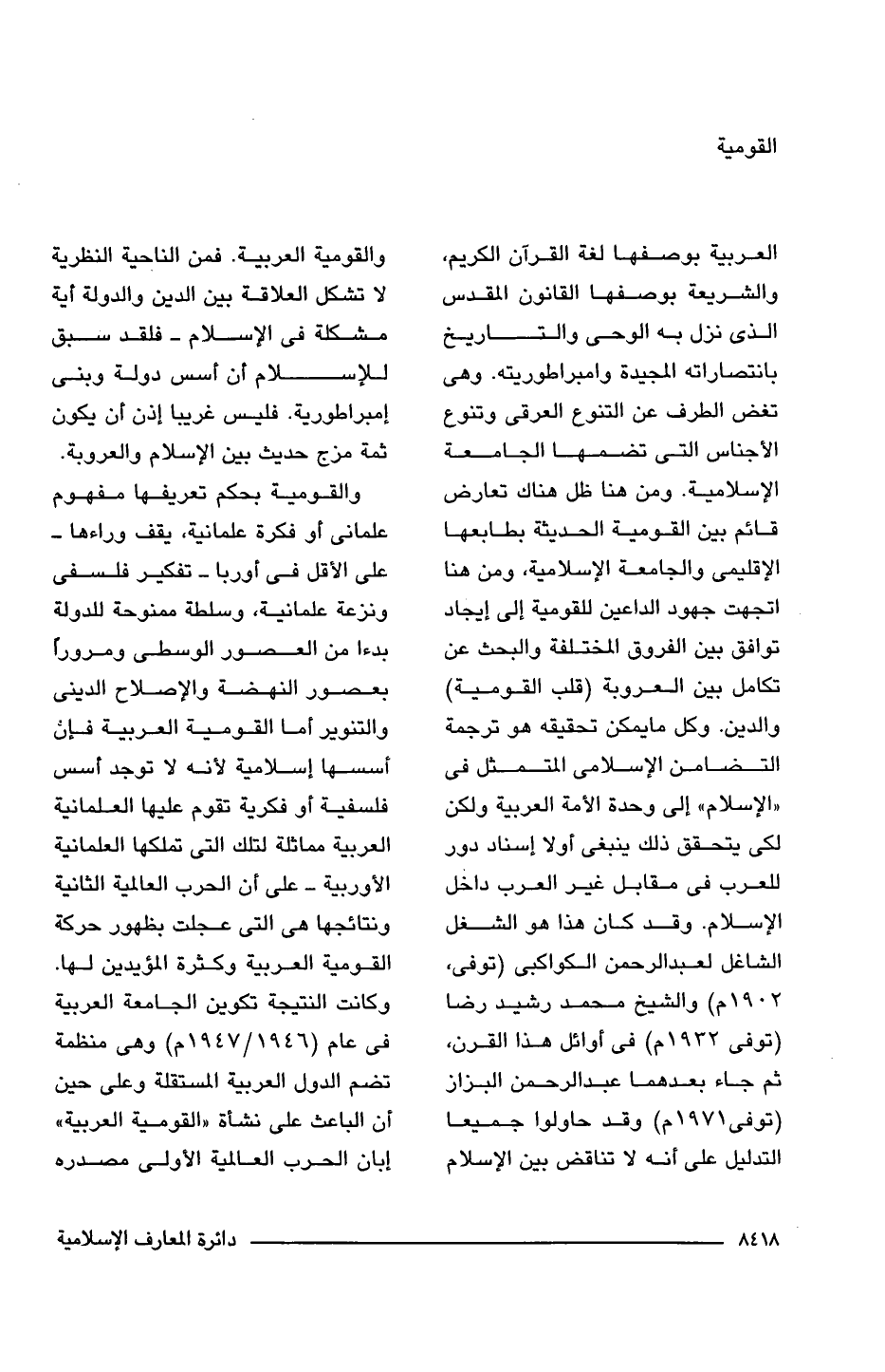 العربية بوصفها لغة القرآن الكريم، والشريعة بوصفها القانون المقدس الذى نزل به الوحى والتاريخ بانتصاراته المجيدة وامبراطوريته. وهى تغض الطرف عن التنوع العرقى وتنوع الأجناس التى تضمها الجامعة الإسلامية. ومن هنا ظل هناك تعارض قائم بين القومية الحديثة بطابعها الإقليمى والجامعة الإسلامية، ومن هنا اتجهت جهود الداعين للقومية إلى إيجاد توافق بين الفروق المختلفة والبحث عن تكامل بين العروبة (قلب القومية) والدين. وكل ما يمكن تحقيقه هو ترجمة التضامن الإسلامى المتمثل فى "الإسلام" إلى وحدة الأمة العربية ولكن لكى يتحقق ذلك ينبغى أولا إسناد دور للعرب فى مقابل غير العرب داخل الإسلام. وقد كان هذا هو الشغل الشاغل لعبد الرحمن الكواكبى (توفى 1902 م) والشيخ محمد رشيد رضا (توفى 1932 م) فى أوائل هذا القرن، ثم جاء بعدهما عبد الرحمن البزاز (توفى 1971 م) وقد حاولوا جميعا التدليل على أنه لا تناقض بين الإسلام والقومية العربية. فمن الناحية النظرية لا تشكل العلاقة بين الدين والدولة أية مشكلة فى الإسلام -فلقد سبق للإسلام أن أسس دولة وبنى إمبراطورية. فليس غريبا إذن أن يكون ثمة مزج حديث بين الإسلام والعروبة.
