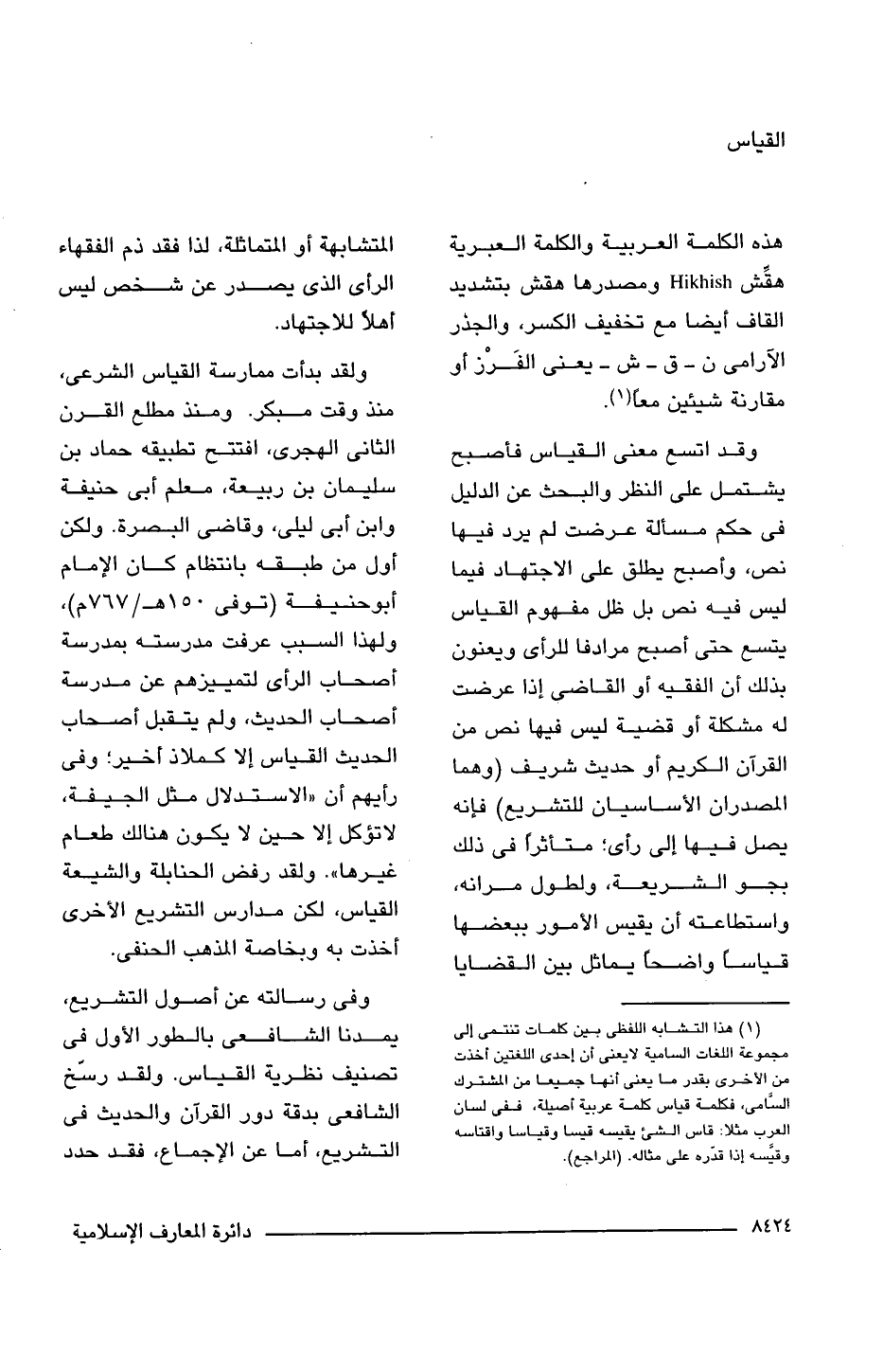 (¬1) هذا التشابه اللفض بين كلمات تنتمى إلى مجموعة اللغات السامية لا يعنى أن إحدى اللغتين أخذت من الأخرى بقدر ما يعنى أنها جميعا من المشترك السامى، فكلمة قياس كلمة عربية أصيلة، ففى لسان العرب مثلا: قاس الشئ يقيسه قيسا وقياسا واقتاسه وقيسه إذا قدره على مثاله. (المراجع).