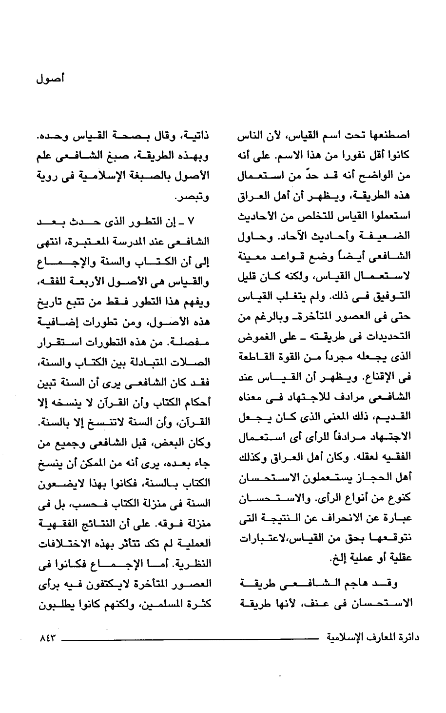 وقد هاجم الشافعى طريقة الاستحسان فى عنف، لأنها طريقة ذاتية، وقال بصحة القياس وحده. وبهذه الطريقة، صبغ الشافعى علم الأصول بالصبغة الاسلامية فى روية وتبصر.