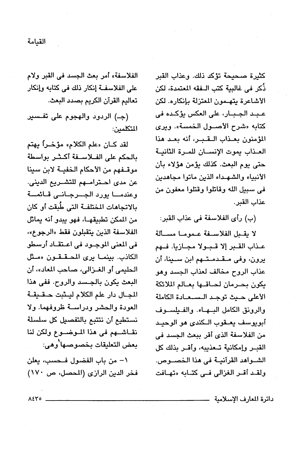لقد كان "علم الكلام" مؤخرًا يهتم بالحكم على الفلاسفة أكثر بواسطة موقفهم من الأحكام الخفية لابن سينا عن مدى احترامهم للتشريع الدينى. وعندما يورد الجرجانى قائمة بالاتجاهات المختلفة التى طُبقت أو كان من الممكن تطبيقها، فهو يبدو أنه يماثل الفلاسفة الذين يتقبلون فقط "الرجوع"، فى المعنى الموجود فى اعتقاد أرسطو الكاذب. بينما يرى المحققون "مثل الحليمى أو الغزالى، صاحب المعاد"، أن البعث يكون بالجسد والروح. ففى هذا المجال دار علم الكلام ليثبت حقيقة العودة والحشر ودراسة ظروفهما. ولا نستطيع أن نتتبع بالتفصيل كل سلسلة نقاشهم فى هذا الموضوع ولكن لنا بعض التعليقات بخصوصها وهى:
