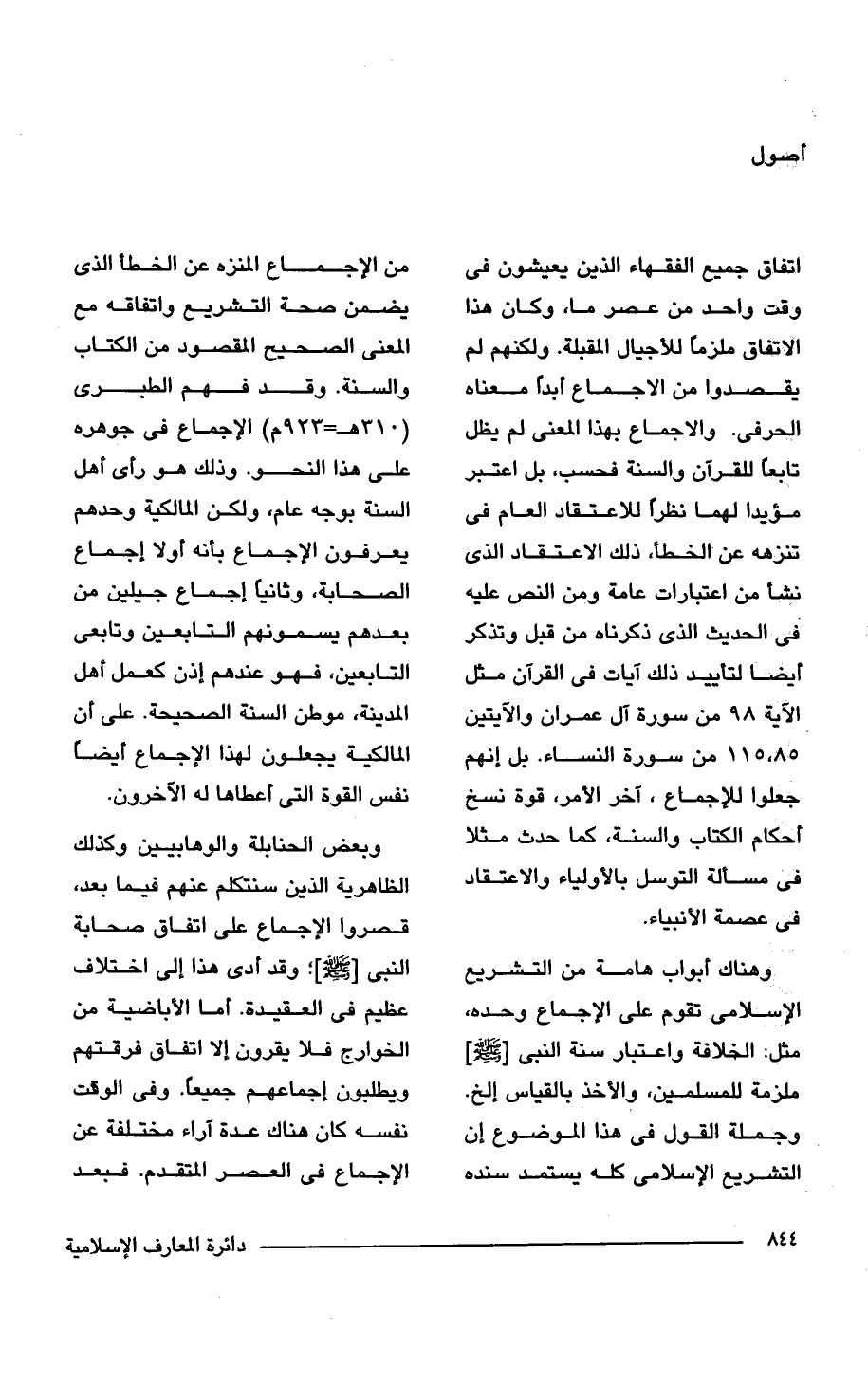 اتفاق جميع الفقهاء الذين يعيشون فى وقت واحد من عصر ما، وكان هذا الاتفاق ملزمًا للأجيال المقبلة. ولكنهم لم يقصدوا من الاجماع أبدًا معناه الحرفى. والاجماع بهذا المعنى لم يظل تابعًا للقرآن والسنة فحسب، بل اعتبر مؤيدا لهما نظرًا للاعتقاد العام فى تنزهه عن الخطأ، ذلك الاعتقاد الذى نشأ من اعتبارات عامة ومن النص عليه فى الحديث الذى ذكرناه من قبل وتذكر أيضا لتأييد ذلك آيات فى القرآن مثل الآية 98 من سورة آل عمران والآيتين 85، 115 من سورة النساء. بل إنهم جعلوا للإجماع، آخر الأمر، قوة نسخ أحكام الكتاب والسنة، كما حدث مثلا فى مسألة التوسل بالأولياء والاعتقاد فى عصمة الأنبياء.