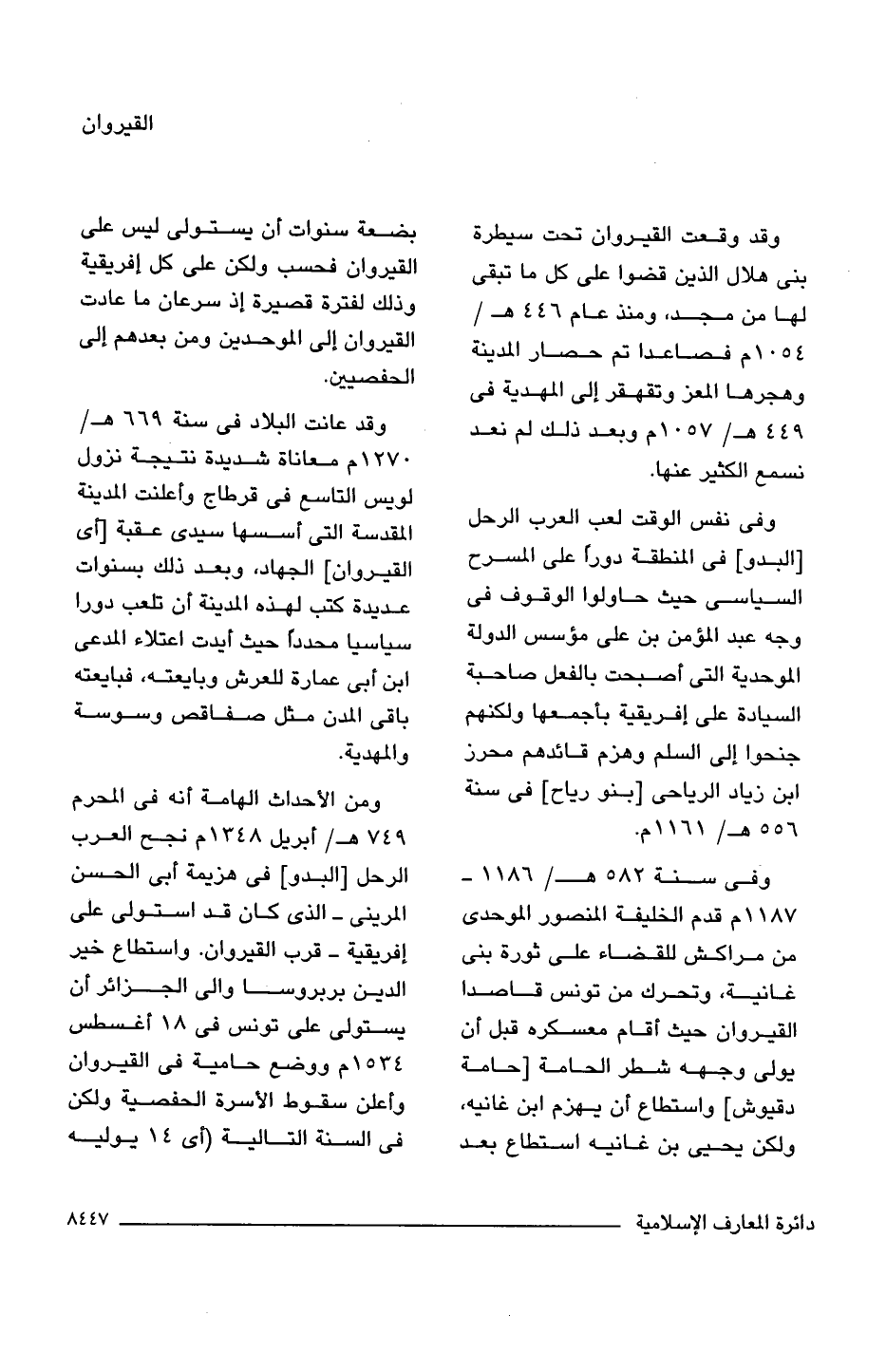 ومن الأحداث الهامة أنه فى المحرم 749 هـ/ أبريل 1348 م نجح العرب الرحل [البدو] فى هزيمة أبى الحسن المرينى -الذى كان قد استولى على إفريقية- قرب القيروان. واستطاع خير الدين بربروسا والى الجزائر أن يستولى على تونس فى 18 أغسطس 1534 م ووضع حامية فى القيروان وأعلن سقوط الأسرة الحفصية ولكن فى السنة التالية (أى 14 يوليه