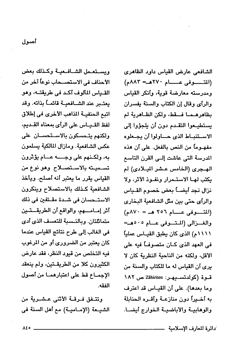 الشافعى عارض القياس داود الظاهرى (المتوفى عام 270 هـ = 883 م) ومدرسته معارضة قوية، وأنكر القياس والرأى وقال إن الكتاب والسنة يفسران بظاهرهما فقط، ولكن الظاهرية لم يستطيعوا التقدم دون أن يلجؤوا إلى الاستنباط الذى حاولوا أن يجعلوه مفهومًا من النص بالفعل. على أن هذه المدرسة التى عاشت إلى القرن التاسع الهجرى (الخامس عشر الميلادى) لم يكتب لها الاستمرار ونفوذ الأثر، ولا نزال نجد أيضا بعض خصوم القياس والرأى حتى بين مثل الشافعية البخارى (المتوفى عام 256 هـ = 870 م) والغزالى (المتوفى عام 505 هـ = 1111 م) الذى كان يطبق القياس عمليًا فى العهد الذى كان متصوفًا فيه على الأقل، ولكنه من الناحية النظرية كان لا يرى أن القياس له ما للكتاب والسنة من قوة (كولدتسيهر: Zahiriten ص 182 وما بعدها). على أن القياس قد اعترف به أخيرًا دون منازعة وأقره الحنابلة والوهابية والأباضية الخوارج أيضا.