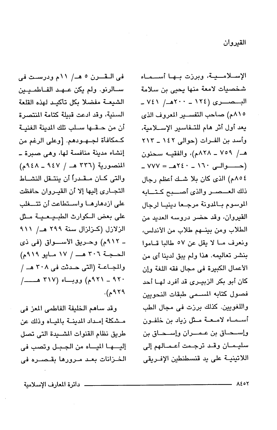 الإسلامية، وبرزت بها أسماء شخصيات لامعة منها يحيى بن سلامة البصرى (124 - 200 هـ/ 741 - 815 م) صاحب التفسير المعروف الذى يعد أول أثر هام للتفاسير الإسلامية، وأسد بن الفرات (حوالى 142 - 213 هـ/ 759 - 828 م)، والفقيه سحنون (حوالى 160 - 240 هـ = 777 - 854 م) الذى كان بلا شك أعظم رجال ذلك العصر والذى أصبح كتابه الموسوم بالمدونة مرجعا دينيا لرجال القيروان، وقد حضر دروسه العديد من الطلاب ومن بينهم طلاب من الأندلس، ونعرف ما لا يقل عن 57 طالبا قاموا بنشر تعاليمه. هذا ولم يبق لدينا أى من الأعمال الكبيرة فى مجال فقه اللغة وإن كان أبو بكر الزبيرى قد أفرد لها أحد فصول كتابه المسمى طبقات النحويين واللغويين. كذلك برزت فى مجال الطب أسماء لامعة مثل زياد بن خلفون وإسحاق بن عمران وإسحاق بن سليمان وقد ترجمت أعمالهم إلى اللاتينية على يد قنسطنطين الإفريقى فى القرن 5 هـ/ 11 م ودرست فى سالرنو. ولم يكن عهد الفاطميين الشيعة مفضلا بكل تأكيد لهذه القلعة السنية، وقد ادعت قبيلة كتامة المنتصرة أن من حقها سلب تلك المدينة الغنية كمكافأة لجهودهم. [وعلى الرغم من إنشاء مدينة منافسة لها، وهى صبرة - المنصورية (336 هـ/ 947 - 948 م) والتى كان مقدرًا أن ينتقل النشاط التجارى إليها إلا أن القيروان حافظت على ازدهارها واستطاعت أن تتغلب على بعض الكوارث الطبيعية مثل الزلازل (كزلزال سنة 299 هـ/ 911 - 912 م) وحريق الأسواق (فى ذى الحجة 306 هـ/ 17 مايو 919 م) والمجاعة (التى حدثت فى 308 هـ/ 920 - 921 م) ووباء (317 هـ/ 929 م).