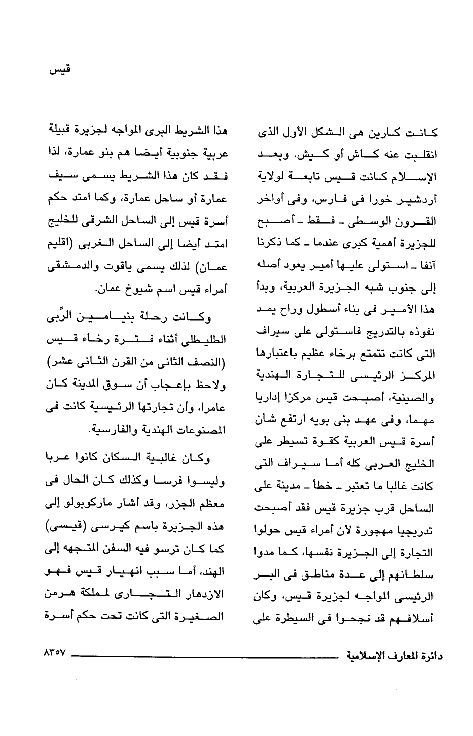 وكان غالبية السكان كانوا عربا وليسوا فرسا وكذلك كان الحال فى معظم الجزر، وقد أشار ماركوبولو إلى هذه الجزيرة باسم كيرسى (قيسى) كما كان ترسو فيه السفن المتجهه إلى الهند، أما سبب انهيار قيس فهو الازدهار التجارى لمملكة هرمن الصغيرة التى كانت تحت حكم أسرة